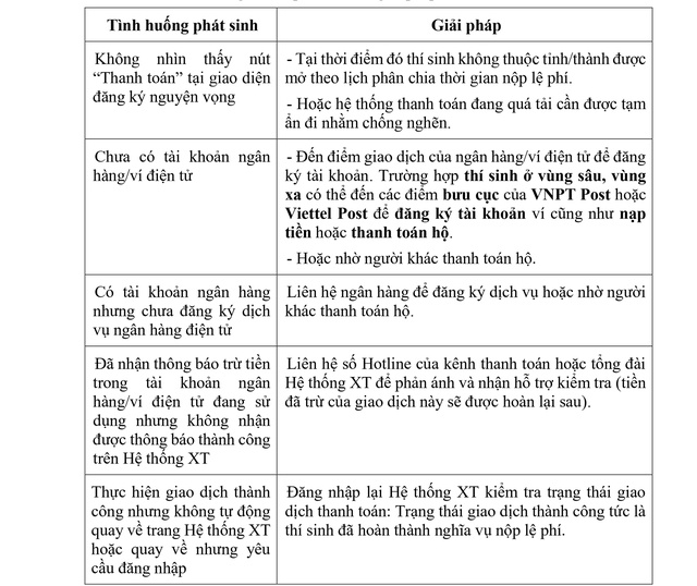 Trong quá trình nộp lệ phí thanh toán, thí sinh có thể liên hệ ngay tới các số điện thoại hỗ trợ của từng kênh thanh toán. Trước khi hỏi, thí sinh cần ghi lại các thông tin cần hỗ trợ để liên hệ hỏi đáp một lần.