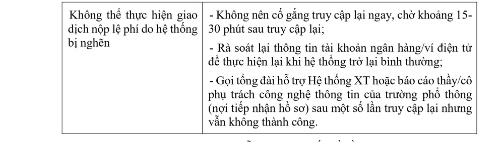 Khi thanh toán, trường hợp thí sinh không nhìn thấy nút “Thanh toán” tại giao diện đăng ký nguyện vọng xét tuyển có nghĩa là thời điểm đó không thuộc khoảng thời gian nộp lệ phí toán hoặc đang được tạm ẩn đi nhằm chống nghẽn hệ thống thanh toán. Quá trình thanh toán trực tuyến phụ thuộc việc kết nối nhiều hệ thống khác nhau vì vậy thí sinh có thể gặp tình huống tắc nghẽn hệ thống. Trong trường hợp đó, thí sinh không nên cố gắng truy cập lại ngay, chờ khoảng 30 phút sau thực hiện lại.