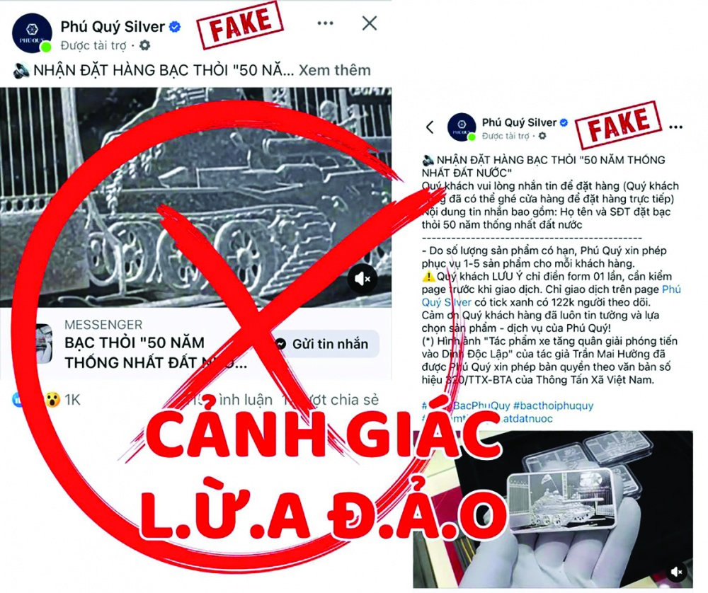 Đáng chú ý, nhân dịp Kỷ niệm 50 năm giải phóng miền Nam, thống nhất đất nước (30/4/1975 - 30/4/2025), các đối tượng còn rao bán các loại bạc thỏi được khắc hình ảnh kỷ niệm sự kiện lịch sử này với giá trị được thổi phồng nhằm đánh vào tâm lý người dân. Theo tìm hiểu của phóng viên, phương thức lừa đảo là mua lại các tài khoản Facebook có tích xanh từ trước, đổi tên thành các thương hiệu uy tín để tạo lòng tin cho người dân, đăng tải nhiều bài viết giống như tài khoản thật của các thương hiệu. Sau đó, chạy quảng cáo, rao bán bạc thỏi sản phẩm với giá tương đương giá bạc trên thị trường, yêu cầu người mua chuyển khoản toàn bộ tiền hàng trước với lý do “hàng có hạn”. Sau khi nhận tiền, các đối tượng lập tức chặn liên lạc với người mua.