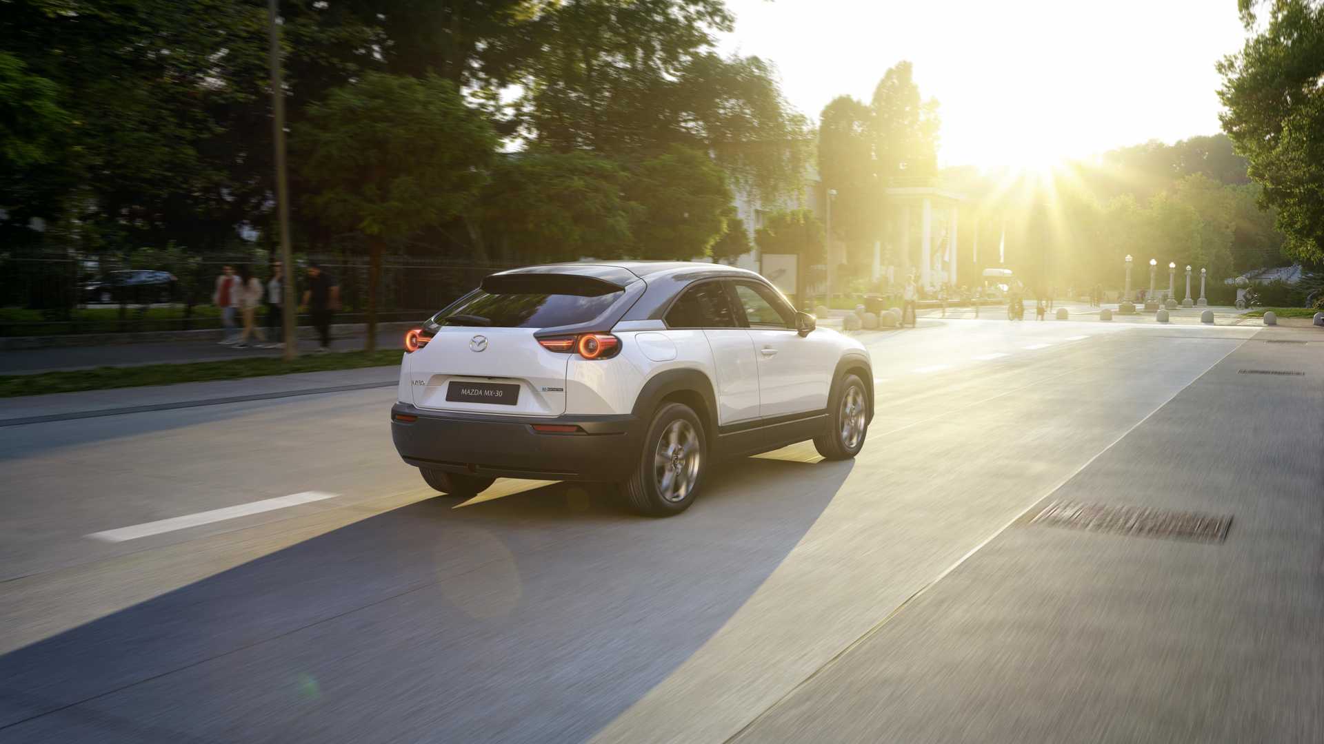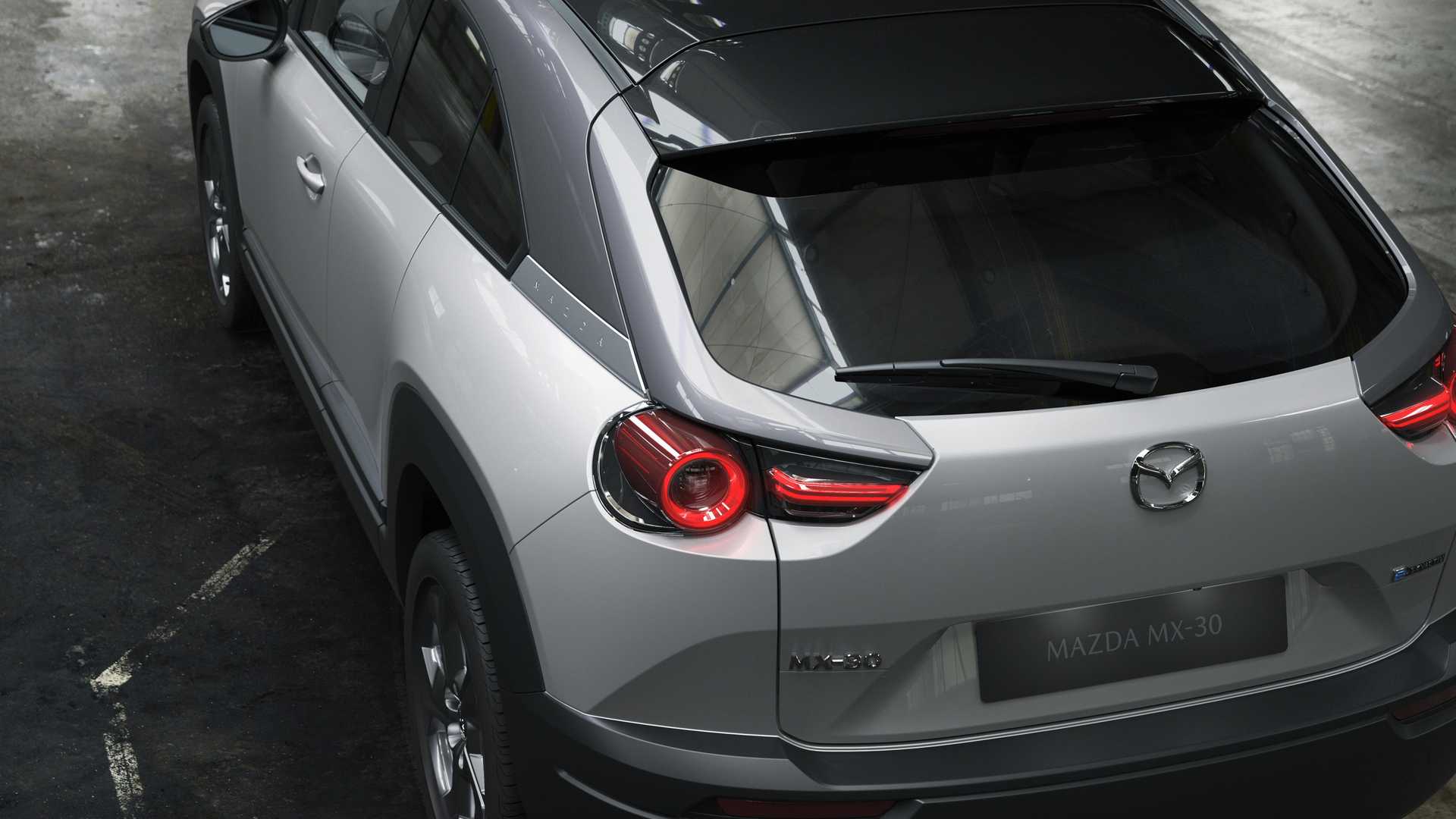 Nhìn từ bên ngoài Mazda MX-30 mang chất SUV lai coupe thể thao đúng nghĩa với vòm bánh xe lớn, ca pô dài và trần xe cong tròn vuốt dần về phía sau.