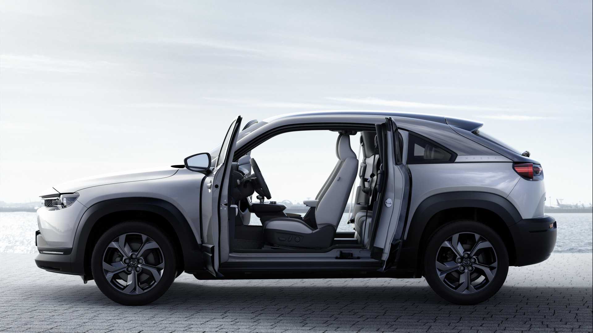 Như có thể quan sát trong ảnh, cửa bên phía sau trên MX-30 thuộc diện vô cùng đặc biệt khi vừa là cửa nghịch, vừa không có tay nắm ngoài. Kích cỡ nhỏ đồng nghĩa với việc người dùng khó ra vào hơn bình thường nhưng giao diện cửa nghịch đã trung hòa yếu tố đó.