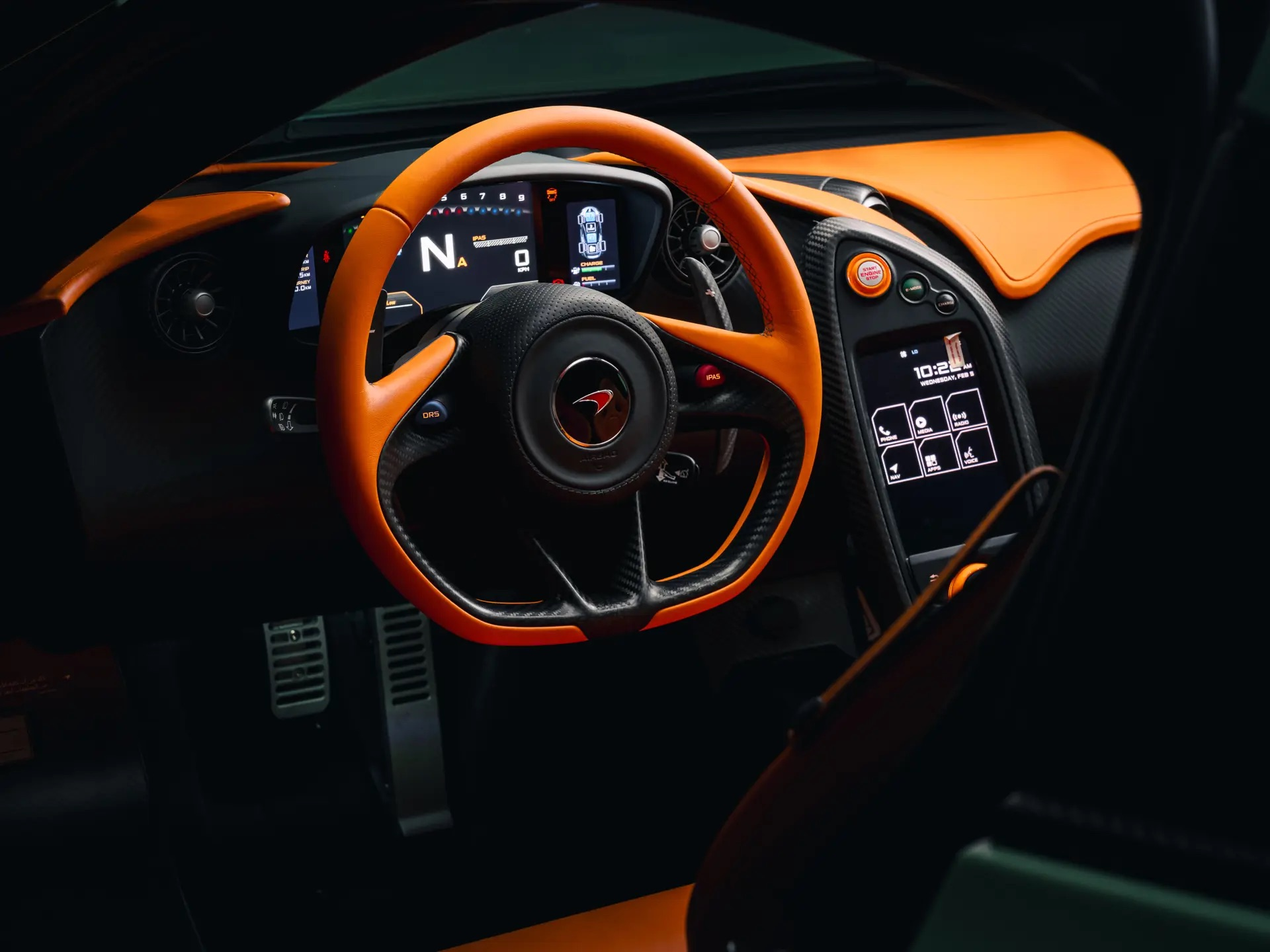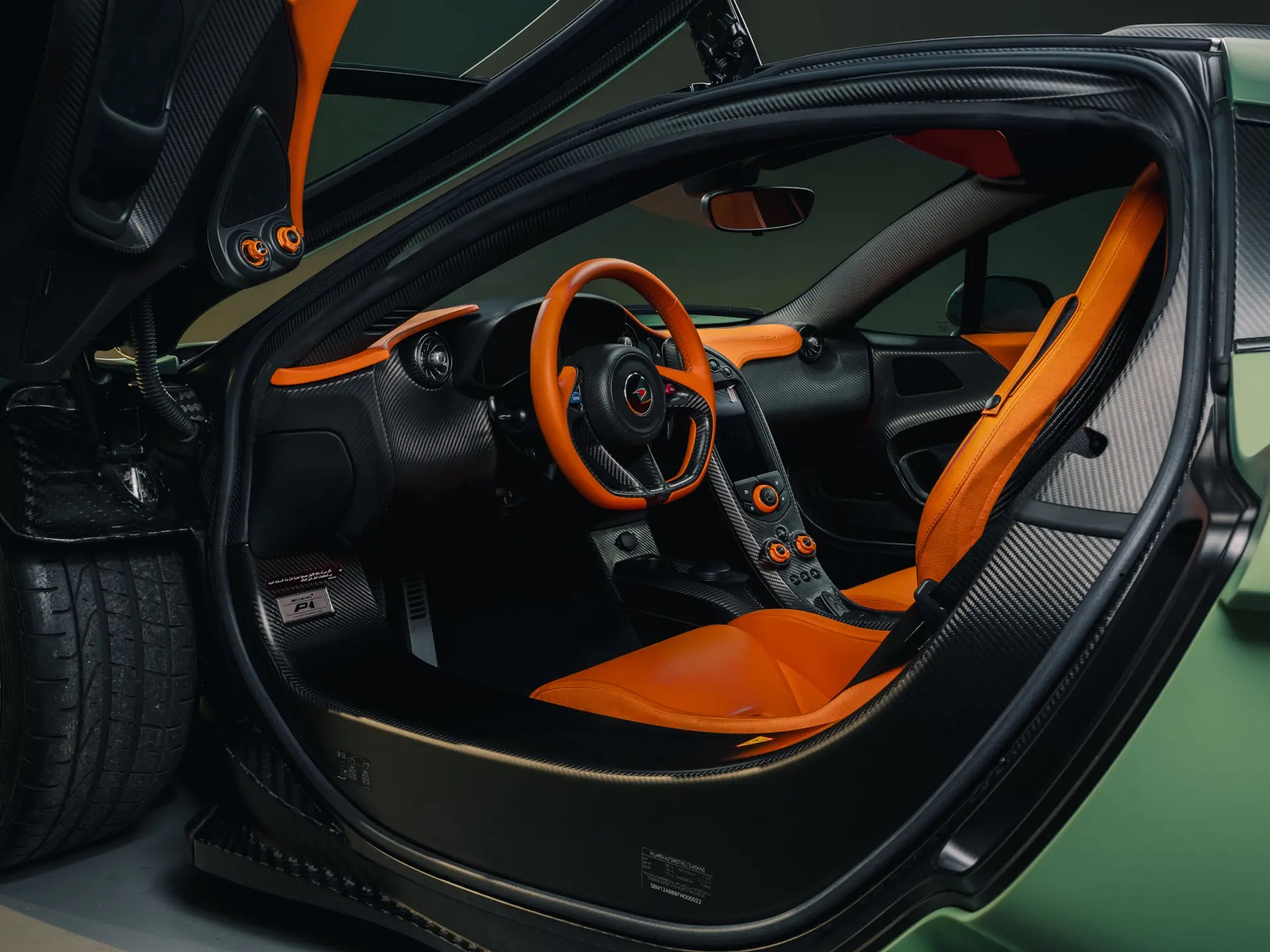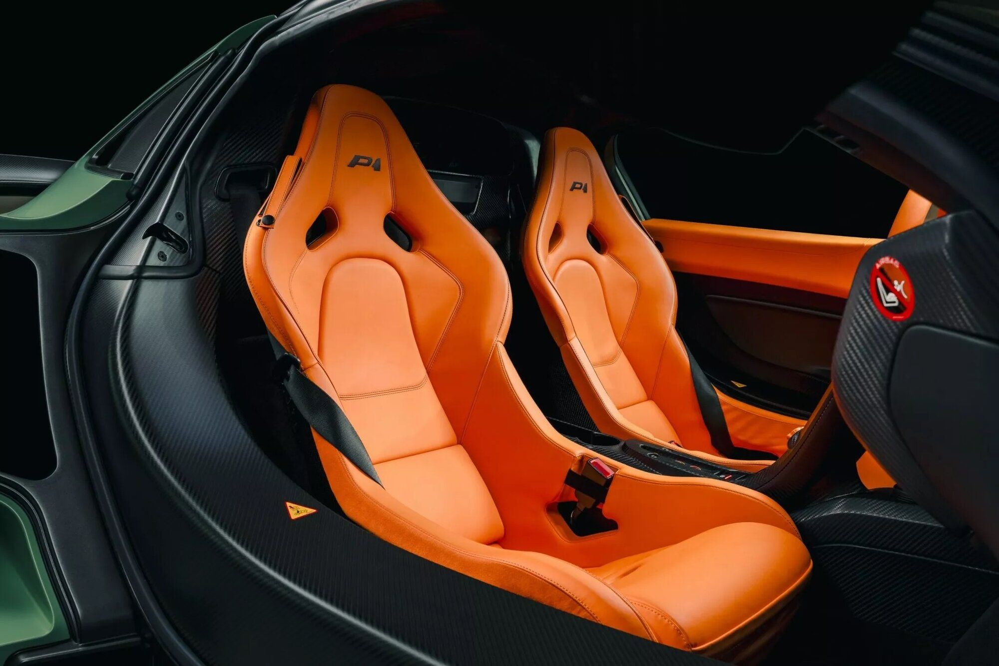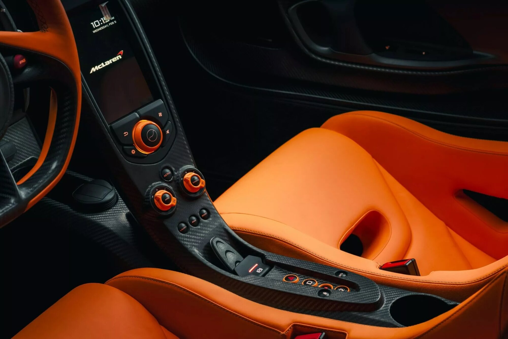 Khoang nội thất của xe cũng ngập tràn các chi tiết màu McLaren Orange, từ chỉ khâu trên ghế da, logo P1 thêu ở tựa đầu và bảng điều khiển, cho đến vô-lăng và các nút chức năng như IRIS, nút khởi động, công tắc đèn và gương chiếu hậu bên tài.
