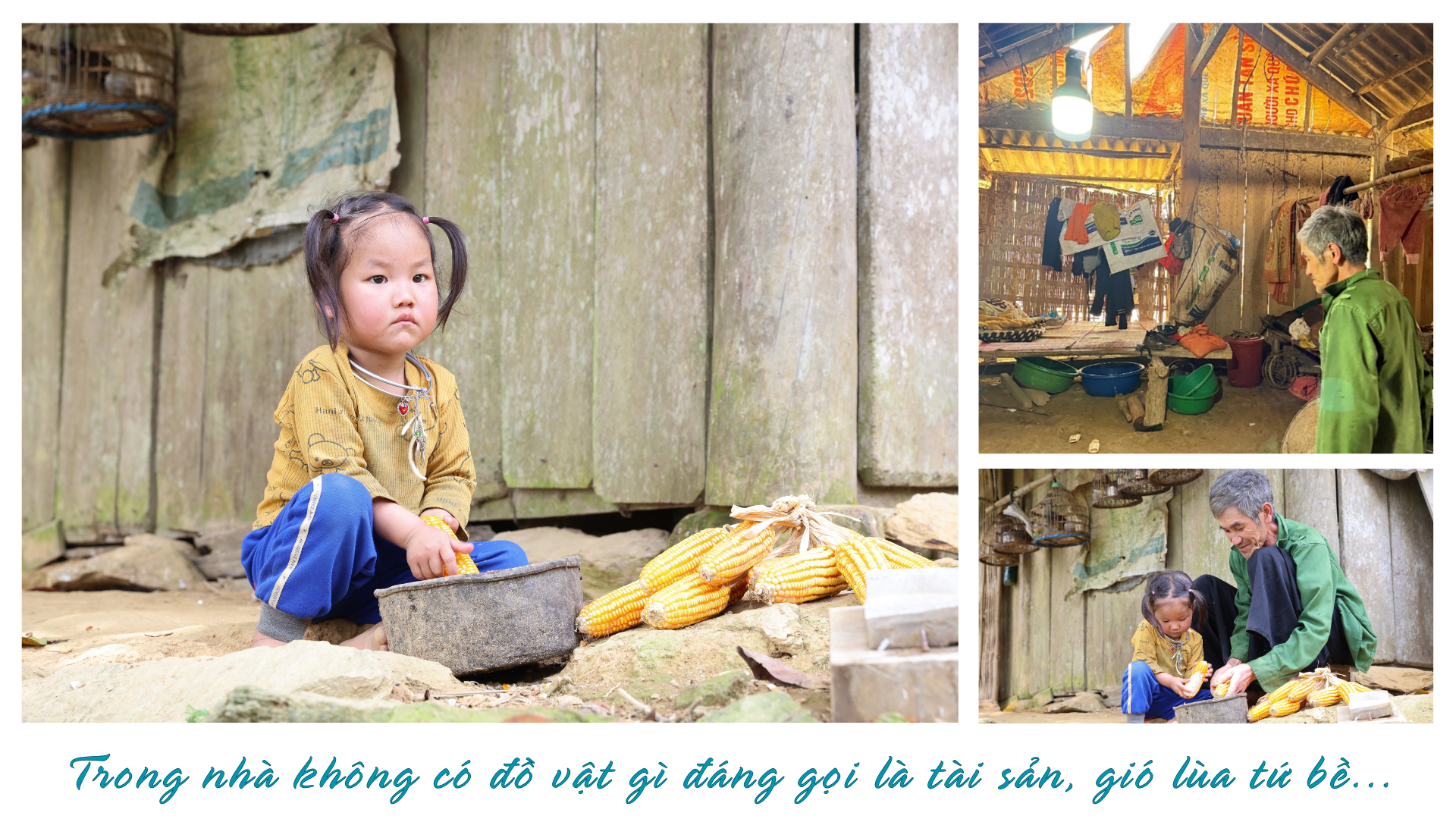 Chúng tôi đến đúng vào buổi trưa nhưng góc bếp nguội lạnh. Chỉ có ba chiếc nồi thì một chiếc đựng nước, một chiếc có nửa nồi cơm trắng. Ngoài một hộp rau cải muối chua, bếp chỉ có gói muối, không có mắm. Tôi hỏi chị Giàng Thị Lề: “Bọn trẻ có bị đói không? “. Chị ngập ngừng rồi trả lời bằng tiếng Kinh chưa sõi: “Ờ thì…bữa có bữa không”. Chị nói mua bốn bao gạo từ đầu tháng, giờ còn hai bao.