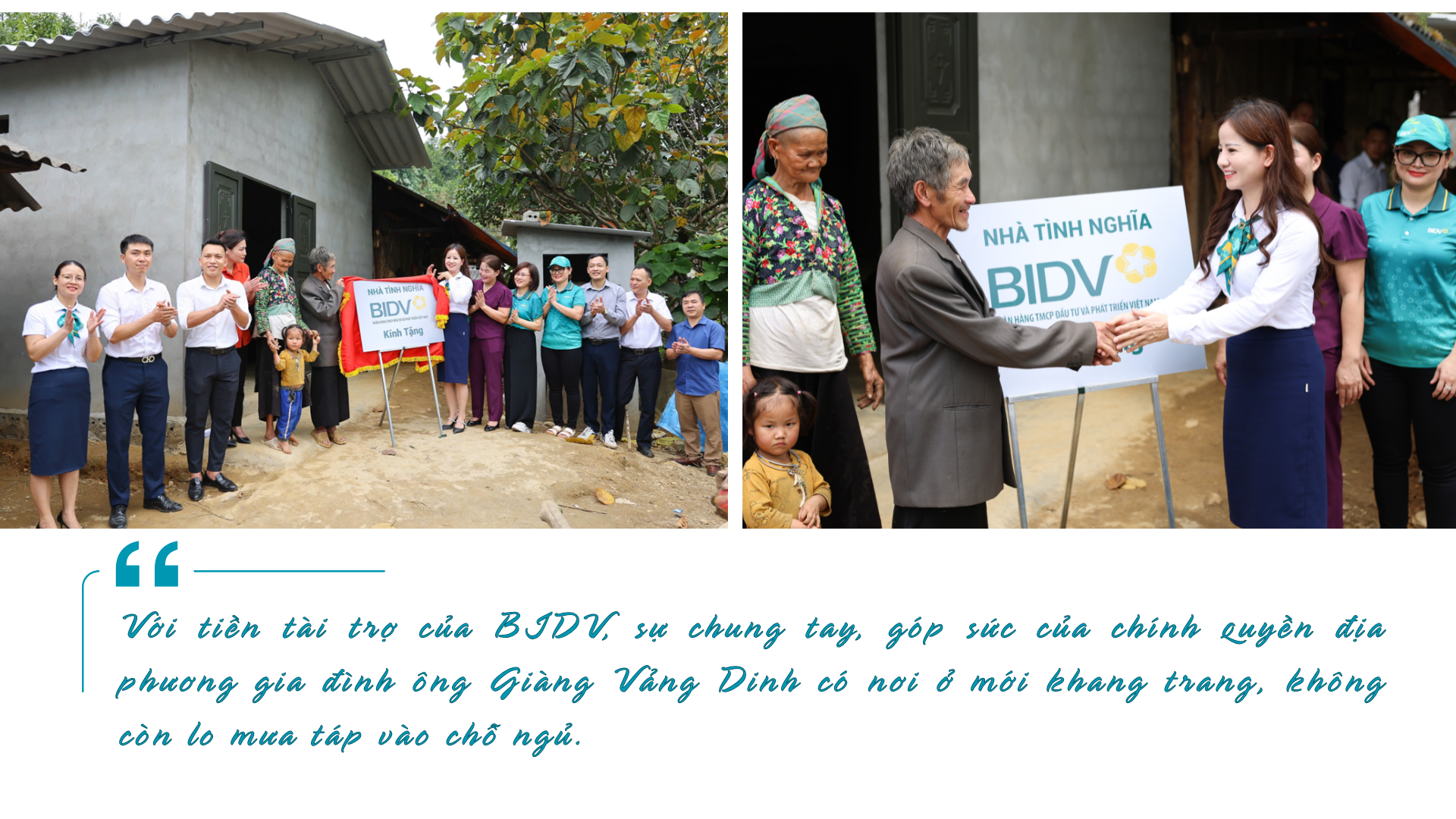Chung tay cùng cả nước, BIDV triển khai chương trình tài trợ xây dựng, sửa chữa nhà dột nát ở các tỉnh trên khắp cả nước như Nghệ An, Yên Bái, Quảng Bình, Hà Giang Khánh Hòa, Cà Mau… Theo chân cán bộ ngân hàng đến một xã vùng cao tỉnh Yên Bái chúng tôi có dịp chứng kiến để rồi thấu hiểu vì sao chương trình xoá nhà tạm, nhà dột nát là mệnh lệnh từ trái tim.