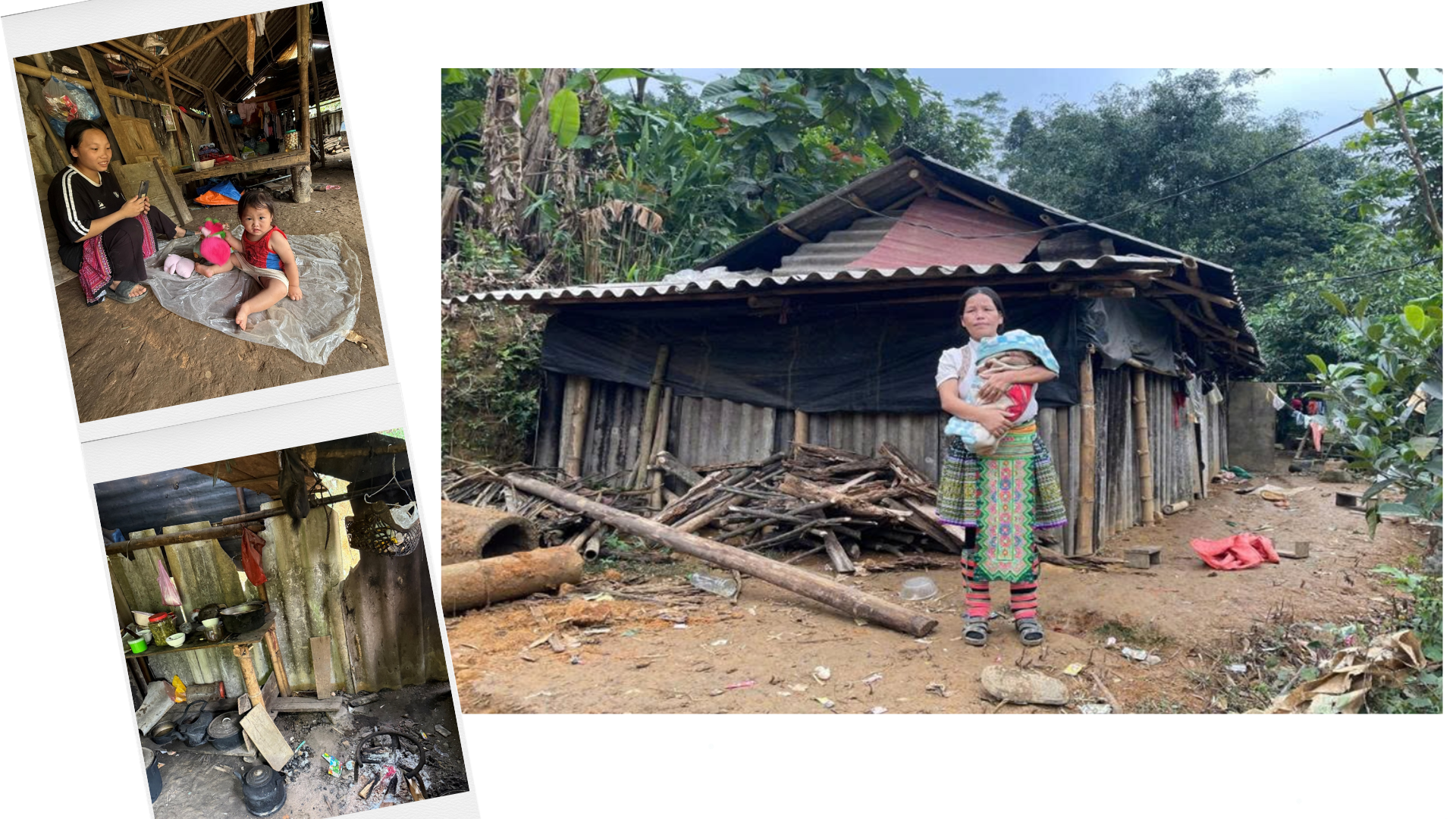 Chị Giàng Thị Lề, sinh năm 1989, lấy chồng từ năm 13 tuổi, đang bế đứa con thứ 12 mới 5 tháng tuổi. Căn “nhà” này từng là nơi trú ngụ của 14 con người. Ngoài bốn em học bán trú, một bé đang bế ngửa, các bé khác ở độ tuổi mẫu giáo thì lê la chơi trên nền đất.