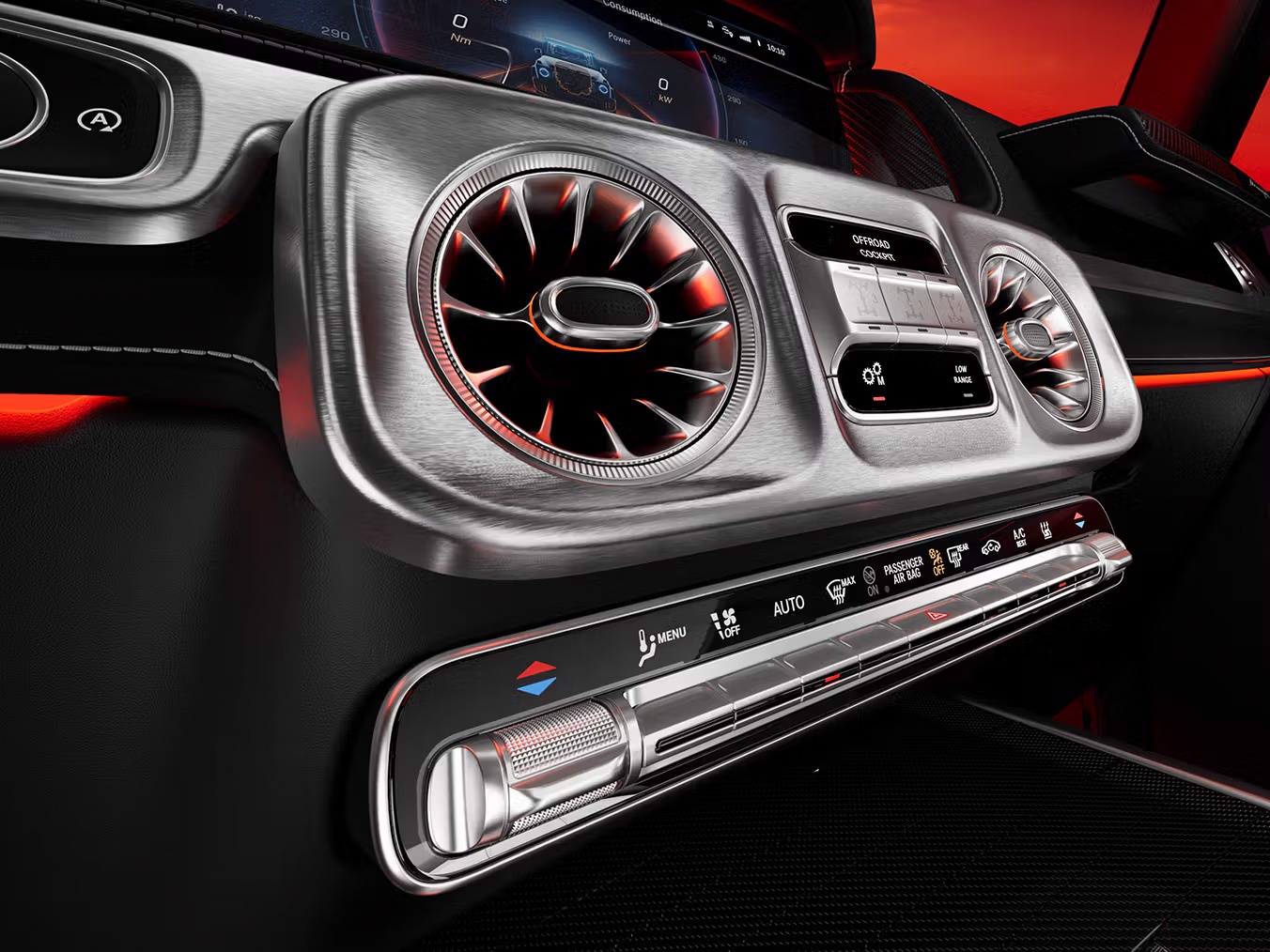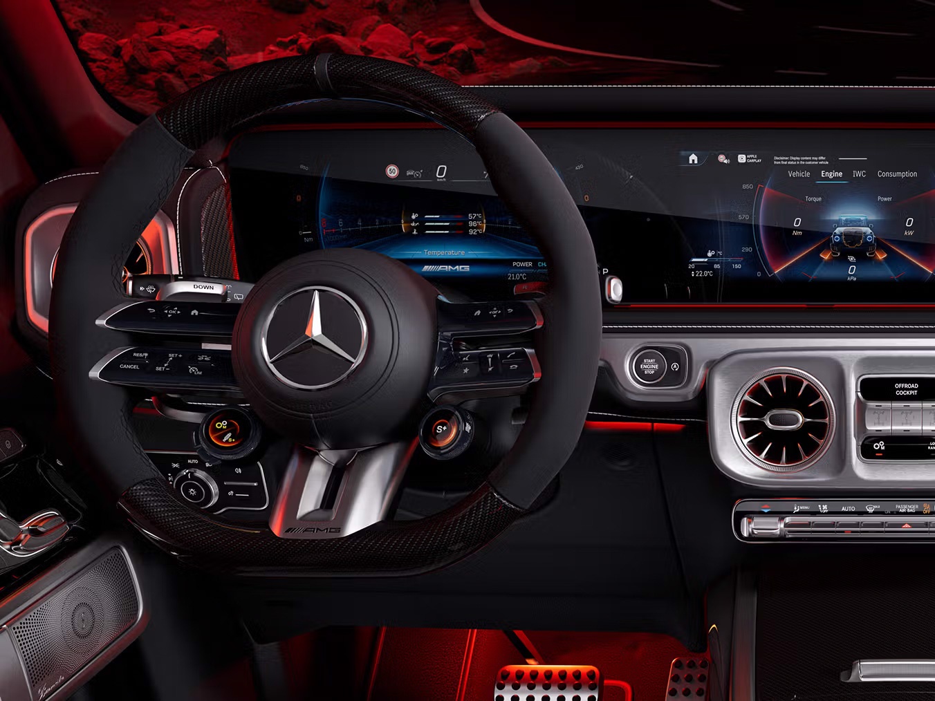 Chi tiết nổi bật ở ngoại thất gồm bộ mâm 21 inch đa chấu phối hai tông màu, đi kèm cùm phanh sơn đỏ và logo AMG tạo điểm nhấn hiệu suất. Bên trong xe, G63 mới tiếp tục duy trì phong cách thiết kế mạnh mẽ, sang trọng với hai màn hình 12,3 inch (một cho bảng đồng hồ kỹ thuật số, một cho giải trí trung tâm). Vô-lăng AMG Performance kết hợp chất liệu carbon và sợi Dinamica cùng các nút cảm ứng hiện đại. Ghế ngồi bọc da Nappa cao cấp với chỉ đỏ nổi bật, trần xe và tapi cửa sử dụng vật liệu mô phỏng da lộn.