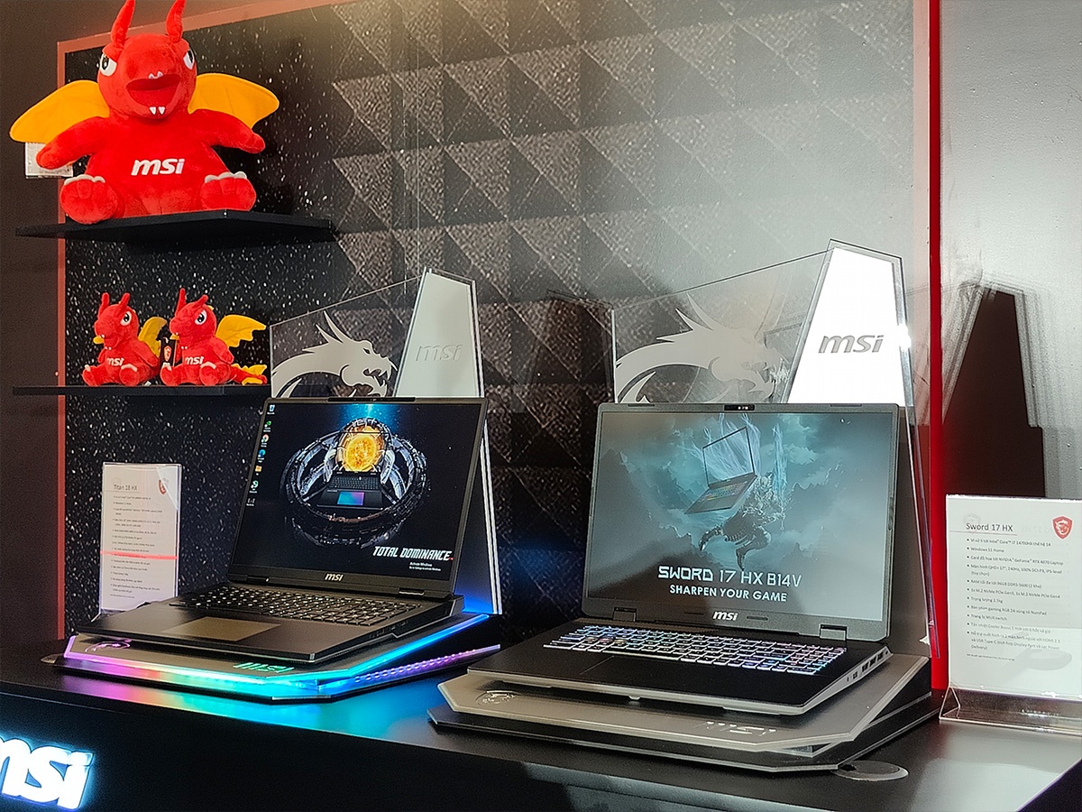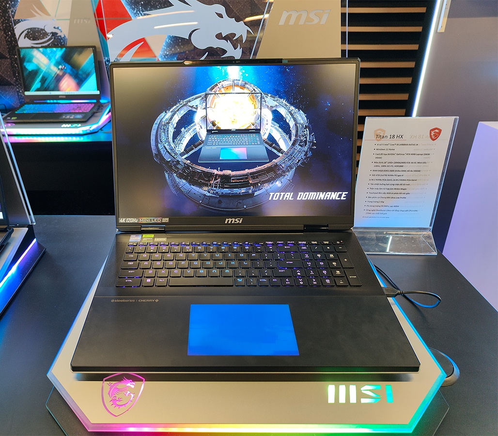 Tại sự kiện, MSI đã giới thiệu dòng laptop gaming màn hình 18-inch mới, bao gồm mẫu MSI Titan 18 HX, Raider 18 HX và Stealth 18 AI Studio. Trang bị chip Intel Core i9 thế hệ 14 và card đồ họa NVIDIA® GeForce RTX™ 40 Series, MSI Titan 18 HX sở hữu hệ thống tản nhiệt buồng hơi lớn nhất hiện nay trên laptop, hỗ trợ công nghệ MSI OverBoost Ultra với mức tổng công suất 270W - con số này trên Raider 18 HX là 250W. Tất cả mẫu laptop gaming thuộc dòng này đều có màn hình 18-inch và thiết kế hoàn toàn mới.