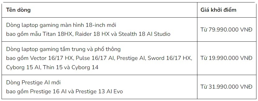 Ngoài ra, MSI cũng cung cấp các dòng laptop gaming tầm trung và phổ thông tại Việt Nam như Vector 16/17 HX và Pulse 16/17 AI, cùng các dòng sản phẩm Prestige AI mới với thiết kế siêu gọn nhẹ và thời lượng pin dài. Trong đó, có mẫu Vector 17 HX sử dụng công nghệ MSI Overboost với tổng công suất điện cho CPU và GPU đạt tới 250W. Còn dòng Pulse AI sở hữu thiết kế tản nhiệt độc đáo để tối ưu luồng gió và có hệ thống đèn nền bàn phím RGB 24 vùng.