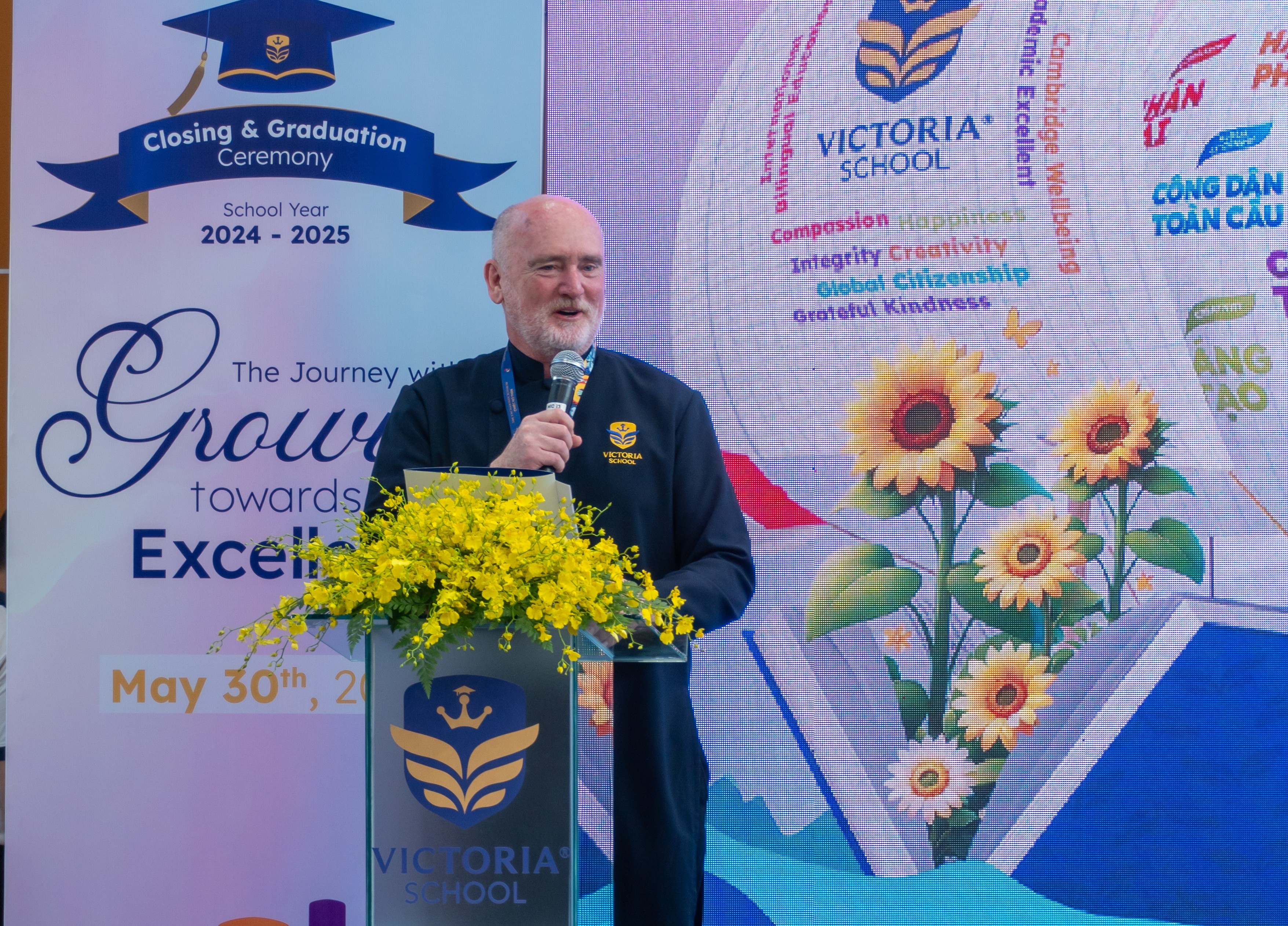 ThS. David Rynne - Tổng Hiệu trưởng Victoria School - Riverside nhắn nhủ: “Mỗi học sinh là một hành trình riêng biệt, một cá thể độc lập với những ước mơ, tài năng và tiềm năng riêng. Nhiệm vụ của nhà trường không chỉ là dạy kiến thức, mà còn là khơi dậy đam mê, truyền cảm hứng và nuôi dưỡng lòng can đảm để các em dám khám phá chính mình và vươn tới điều tốt đẹp nhất.”