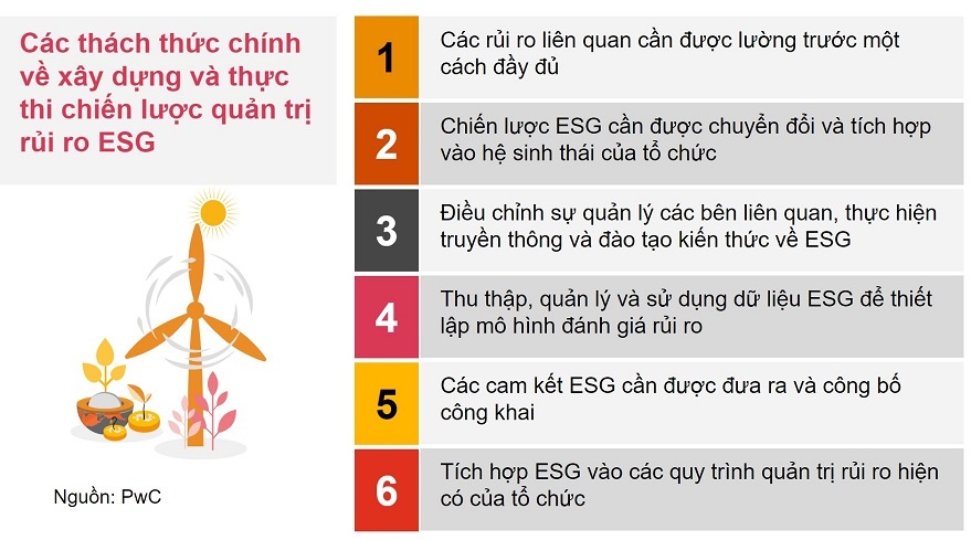 Ở xuất phát điểm để xây dựng và thực thi chiến lược quản trị rủi ro ESG, theo quan điểm của PwC, các tổ chức dịch vụ tài chính có thể sẽ đối mặt những thách thức sau đây: