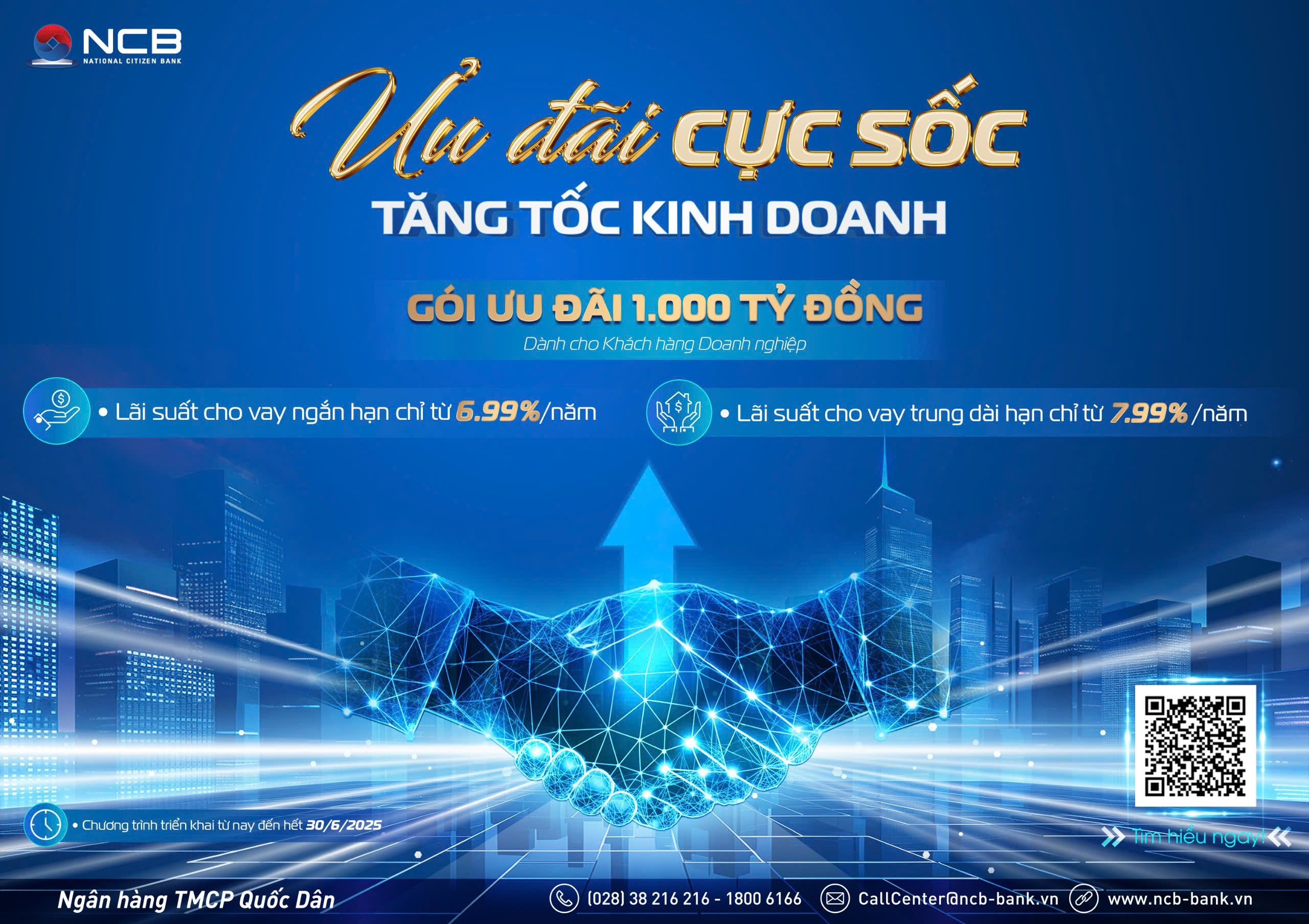 Bên cạnh đó, Ngân hàng NCB cũng đang triển khai chiến dịch “Ưu đãi cực sốc - Tăng tốc kinh doanh” dành riêng cho các doanh nghiệp vừa và nhỏ (SME). Gói tín dụng ưu đãi trị giá lên đến 1.000 tỷ đồng, áp dụng từ nay đến hết ngày 30/6/2025. Với hai gói vay linh hoạt, NCB cung cấp giải pháp tài chính ưu việt cùng lãi suất cạnh tranh, quy trình giải ngân nhanh chóng, giúp doanh nghiệp dễ dàng tiếp cận nguồn vốn, tạo điểm tựa vững chắc và sức bật kinh doanh trong năm mới.