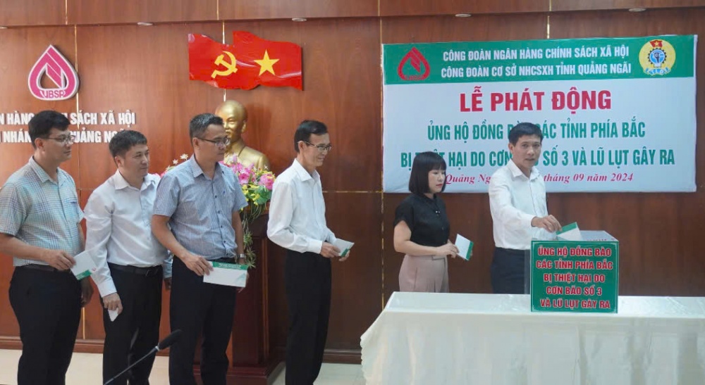 Hưởng ứng lời kêu gọi ủng hộ đồng bào các tỉnh, thành phía Bắc bị thiệt hại do cơn bão số 3 và lũ lụt gây ra, Công đoàn cơ sở Ngân hàng Chính sách xã hội, chi nhánh Quảng Ngãi đã tổ chức lễ phát động kêu gọi mỗi cán bộ đoàn viên, người lao động trong chi nhánh ủng hộ một ngày lương cho đồng bào các địa phương bị thiệt hại do cơn bão số 3 và lũ lụt gây ra.