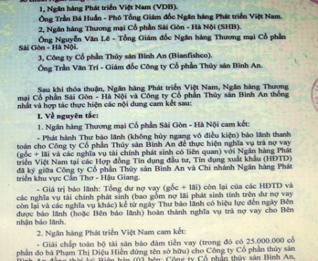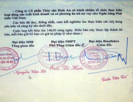 Về phía VDB cũng cam kết tạo điều kiện để Bianfishco thay đổi giấy đăng ký kinh doanh với tên người đại diện theo pháp luật là ông Trần Văn Trí đồng thời đề nghị Sở Kế hoạch và Đầu tư TP Cần Thơ ghi nhận SHB là cổ đông nắm giữ 50% của Bianfishco.
