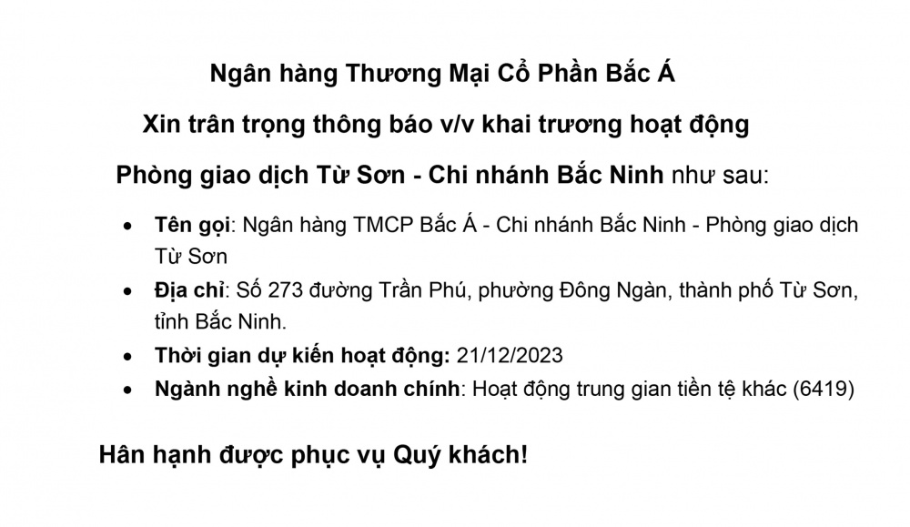 Ngân hàng Thương mại Cổ Phần Bắc Á thông báo khai trương hoạt động phòng giao dịch Từ Sơn - chi nhánh Bắc Ninh