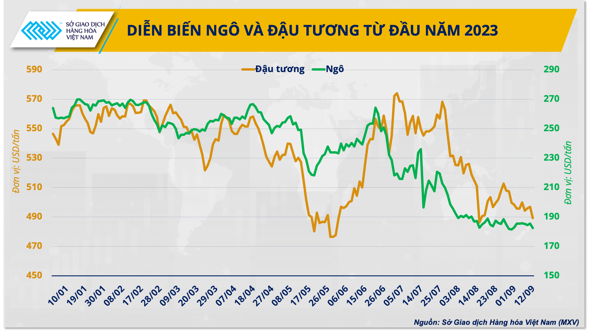 Theo số liệu từ Sở giao dịch Hàng hóa Việt Nam (MXV), sau khi đạt đỉnh vào năm ngoái, giá các mặt hàng nguyên liệu thức ăn chăn nuôi hiện đều giảm mạnh. Trong đó, giá ngô, đậu tương và lúa mì đã hạ khoảng 15-30% so với hồi đầu năm. Điều này giúp giảm gánh nặng chi phí sản xuất cho doanh nghiệp ngành chăn nuôi, đồng thời tăng tỷ lệ tái đàn.