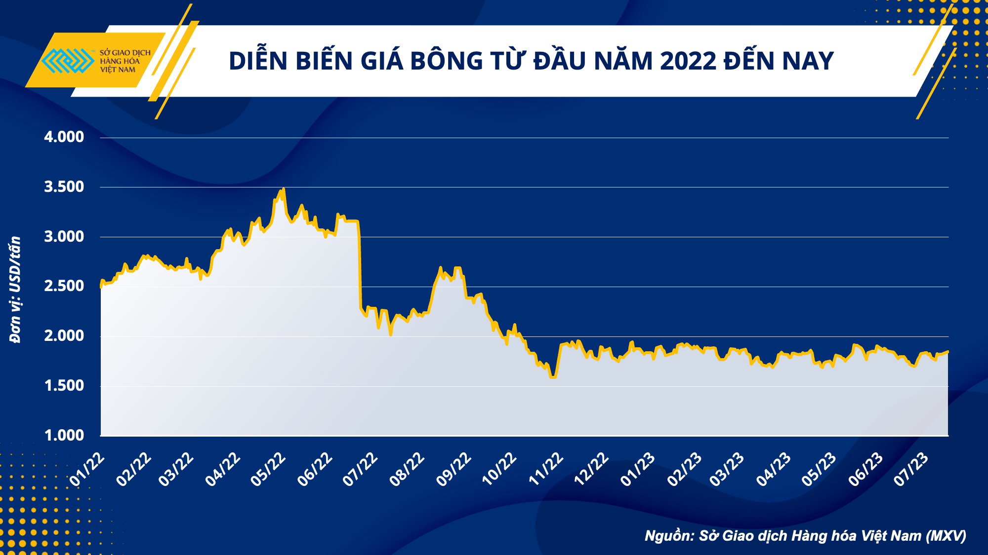 Từ cuối năm 2022 đến nay, giá bông khá ổn định, chủ yếu giằng co với biên độ nhỏ trong khoảng 1.800 - 1.900 USD/tấn. Theo Sở giao dịch hàng hóa Việt Nam (MXV), giá bông giao dịch trên Sở Giao dịch Liên lục địa (ICE) tính đến hết ngày 18/7 ở mức 1.847 USD/tấn, giảm gần 1,5 lần so với mức giá cao gần 2.700 USD/tấn được ghi nhận hồi tháng 8 năm ngoái.