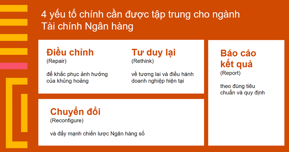 Từ những phân tích trong dự án Tương lai của các Ngành (Future of Industries), chúng tôi đã xác định và đưa ra bốn yếu tố chính cần được tập trung cho ngành Tài chính Ngân hàng, bao gồm: Điều chỉnh (Repair), Tư duy (Rethink), Chuyển đổi (Reconfigure) và Báo cáo kết quả (Report).