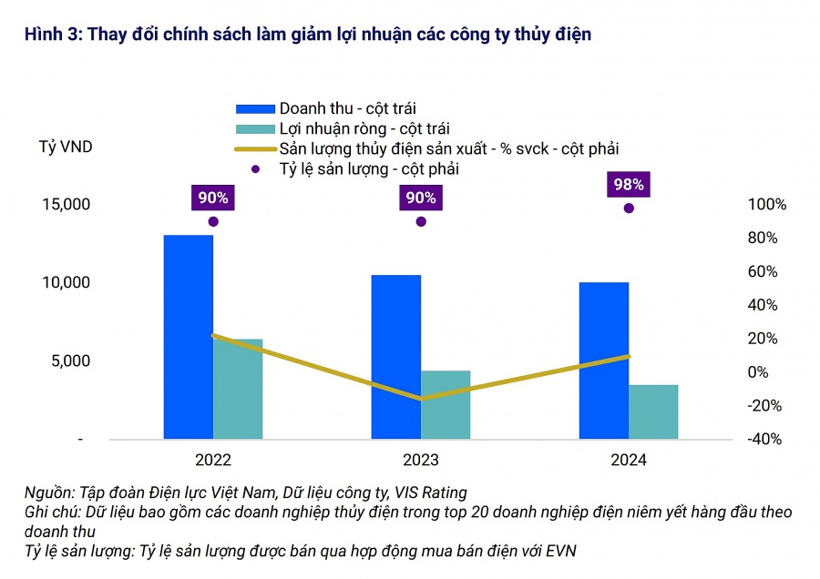 Mặc dù sản lượng thủy điện tăng 10% nhờ điều kiện thời tiết thuận lợi, nhưng lợi nhuận của nhóm thủy điện lại giảm mạnh do chính sách mới từ Bộ Công Thương. Cụ thể, các nhà máy phải cắt giảm sản lượng bán trên thị trường điện cạnh tranh - nơi giá cao hơn hợp đồng dài hạn với EVN - dẫn đến tổng doanh thu và lợi nhuận ròng toàn khối giảm lần lượt 4,4% và 20,4%.