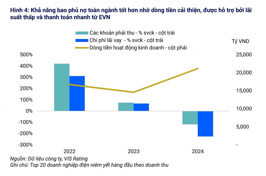 Cũng theo VIS Rating, mặc dù lợi nhuận ảm đạm, ngành điện vẫn cho thấy sức khỏe tài chính vững vàng nhờ dòng tiền hoạt động tăng mạnh 48% so với cùng kỳ trong năm 2024. Việc EVN cải thiện thanh khoản, thanh toán công nợ nhanh hơn sau đợt tăng giá bán lẻ điện gần đây đã hỗ trợ tích cực cho doanh nghiệp ngành điện.