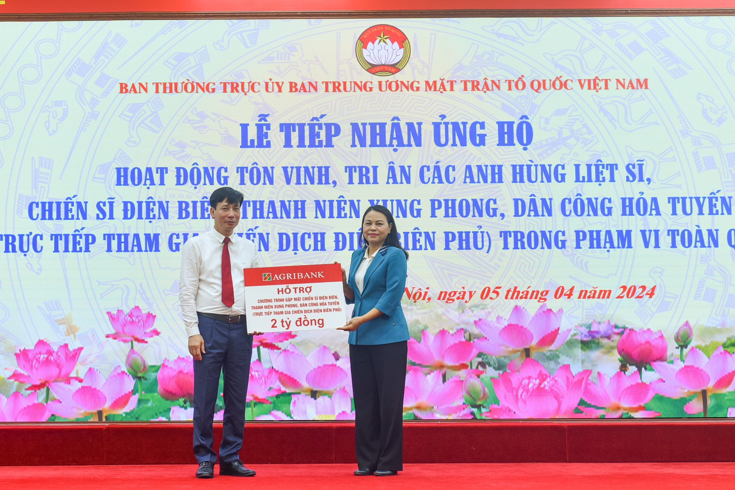 Nhân dịp này, Agribank cũng trao ủng hộ số tiền 2 tỷ đồng nhằm hỗ trợ chương trình gặp mặt chiến sĩ Điện Biên, thanh niên xung phong, dân công hỏa tuyến trực tiếp tham gia chiến dịch Điện Biên Phủ.