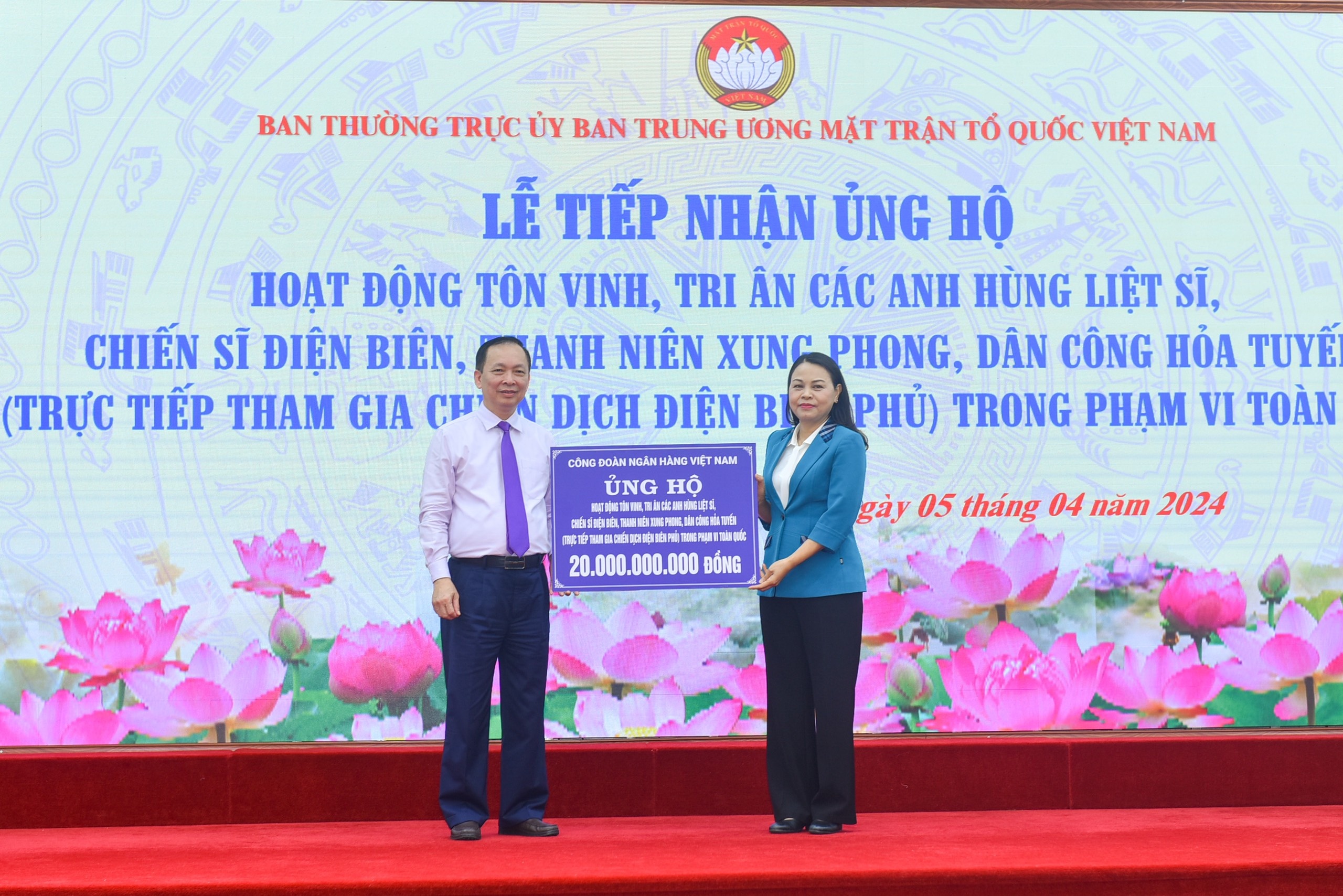 Tại Lễ tiếp nhận, đồng chí Đào Minh Tú đã trao số tiền 20 tỷ đồng từ Công đoàn Ngân hàng Việt Nam tới Ủy ban Trung ương Mặt trận Tổ quốc Việt Nam với mong muốn số tiền này sẽ cùng với Mặt trận Tổ quốc Việt Nam tôn vinh, tri ân các anh hùng liệt sĩ, chiến sĩ Điện Biên, thanh niên xung phong, dân công hỏa tuyến trực tiếp tham gia chiến dịch Điện Biên Phủ.