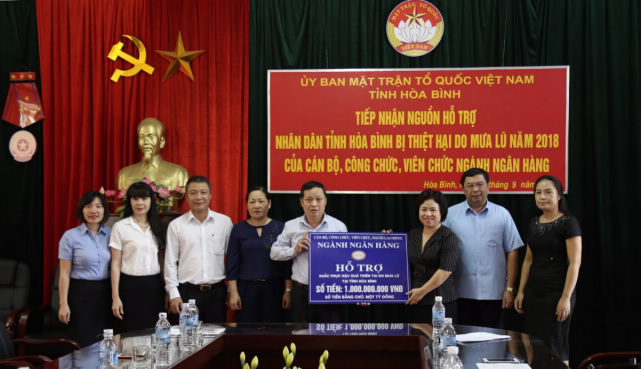 Chiều ngày 6/9/2018, tại trụ sở Ủy ban MTTQ Việt Nam tỉnh Hoà Bình, Giám đốc NHNN tỉnh và đại diện Công đoàn Ngân hàng Việt Nam trên địa bàn đã trao số tiền 1 tỷ đồng ủng hộ đồng bào tỉnh Hoà Bình bị thiệt hại do mưa lũ xảy ra cuối tháng 8/2018. Toàn bộ kinh phí trên được trích từ lương, thu nhập của cán bộ, công chức, viên chức, người lao động ngành Ngân hàng Việt Nam.