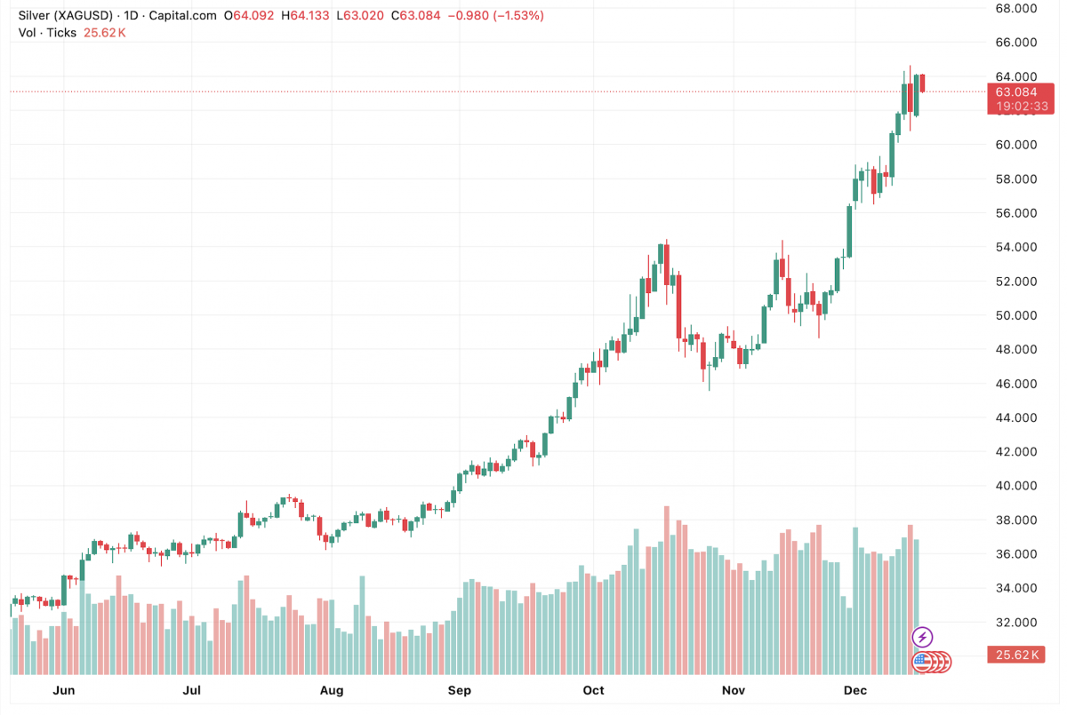 Tính đến cuối phiên hôm qua, giá bạc giao ngay tăng 2,6% lên 63,61 USD/oz sau khi chạm mức kỷ lục 64,65 USD vào thứ Sáu, tiếp tục neo gần mốc lịch sử 65 USD/oz.