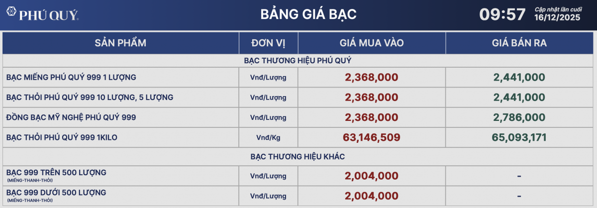 Tính đến 10h00 ngày 16/12, giá bạc miếng 999 (1 lượng) tại Tập đoàn Vàng bạc Đá quý Phú Quý niêm yết ở ngưỡng 2,36 - 2,44 triệu đồng/lượng (mua vào và bán ra) tăng 35.000 đồng/lượng ở chiều mua vào và tăng 28.000 đồng/lượng ở chiều bán ra so với phiên giao dịch sáng 15/12.