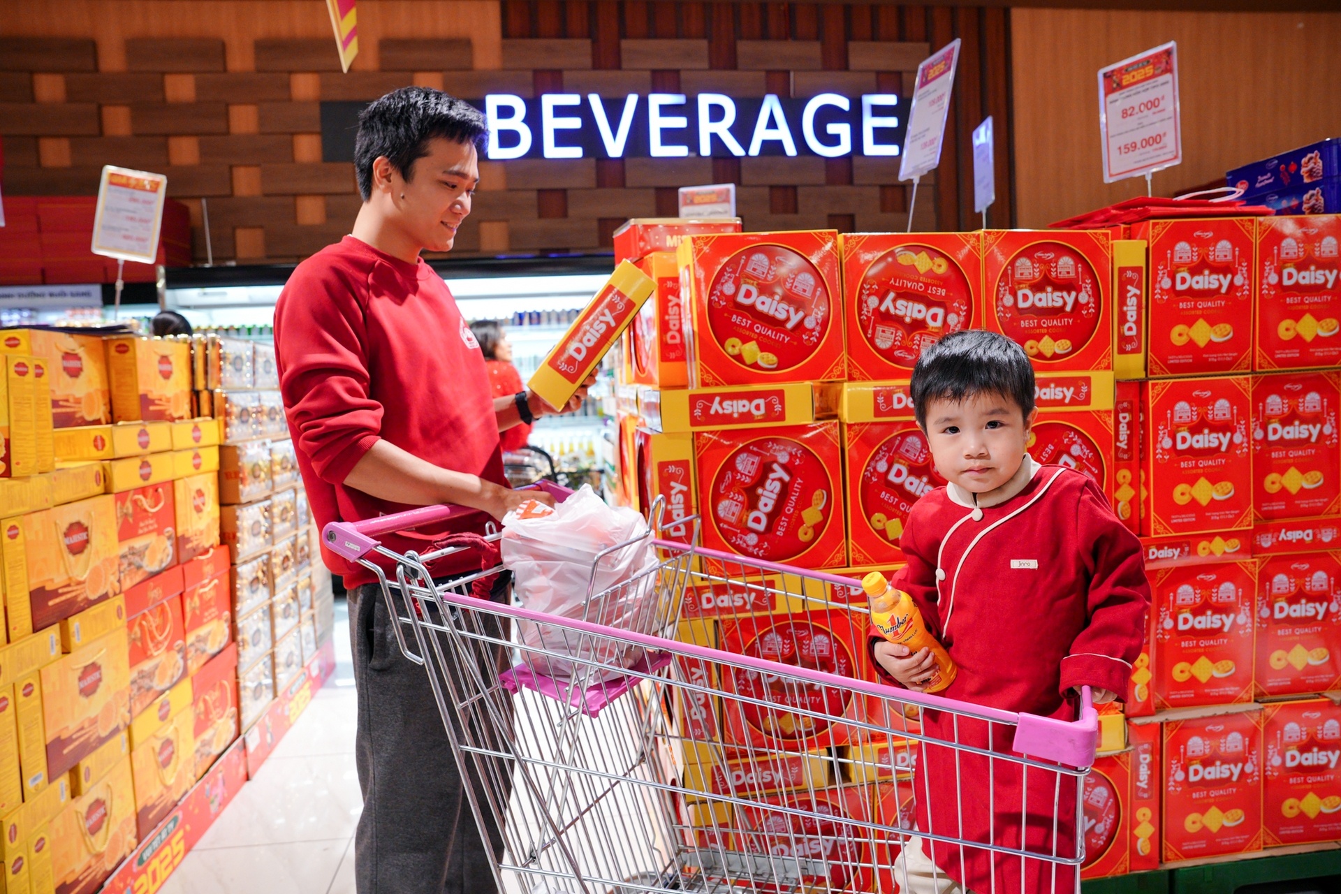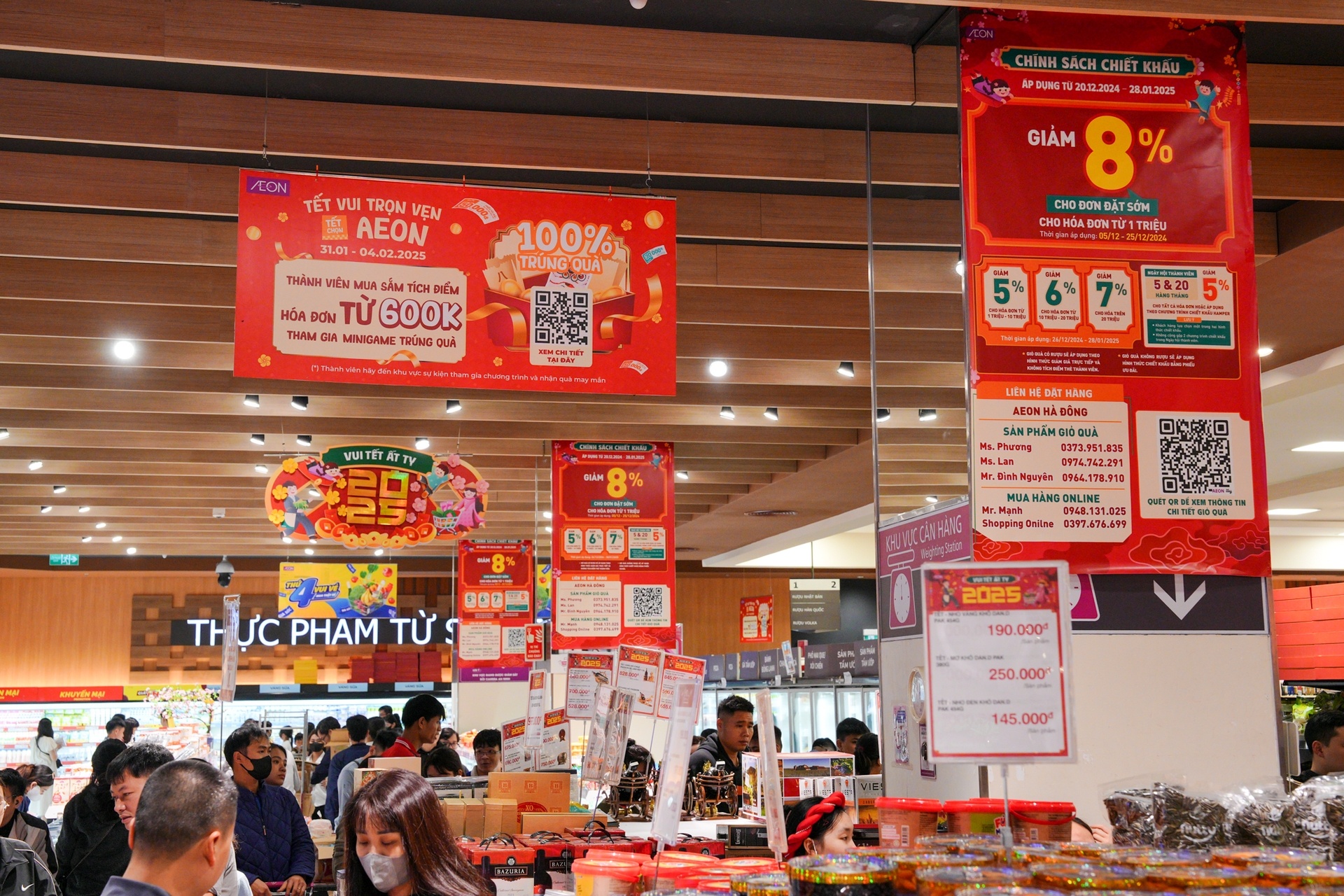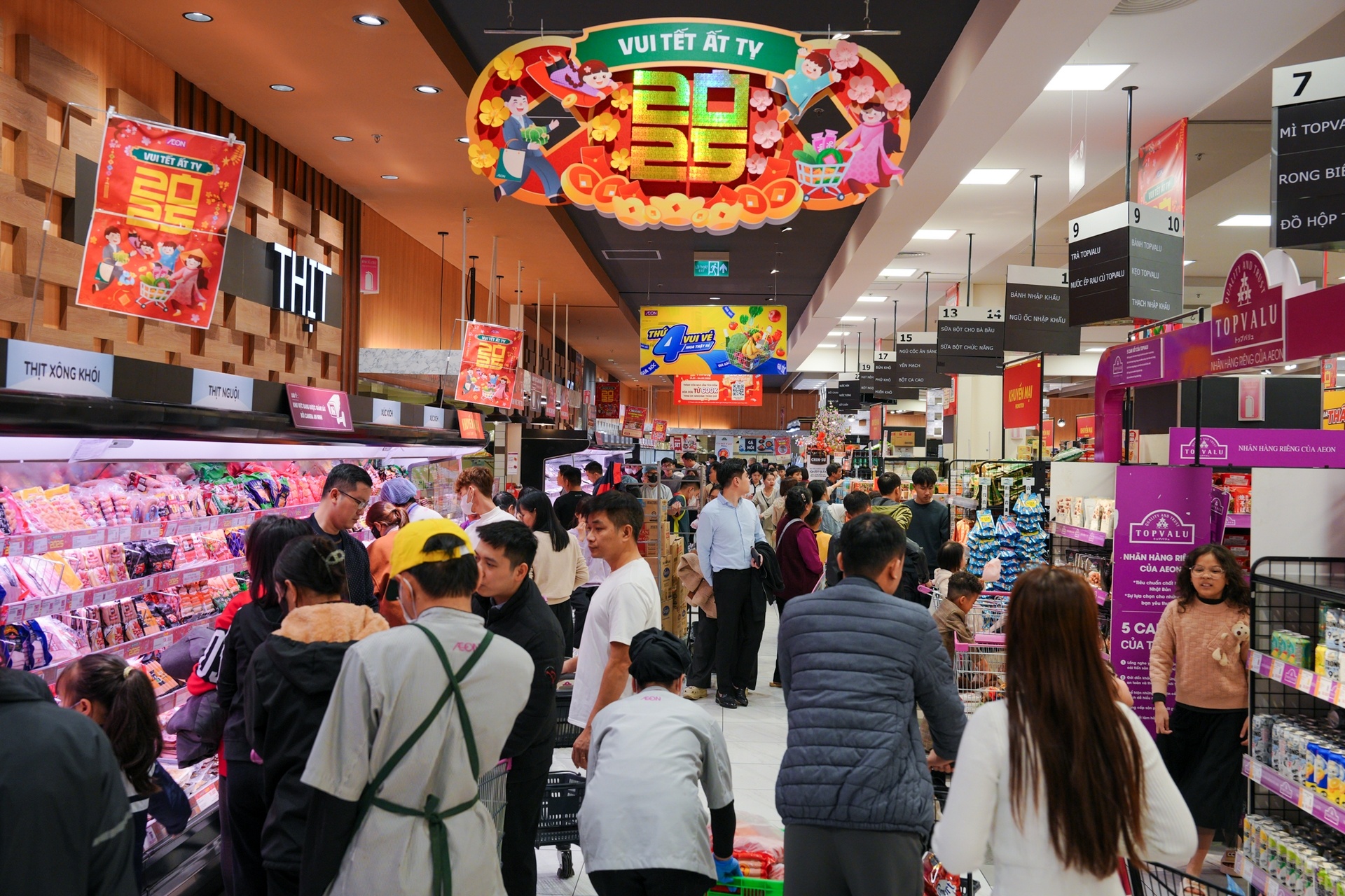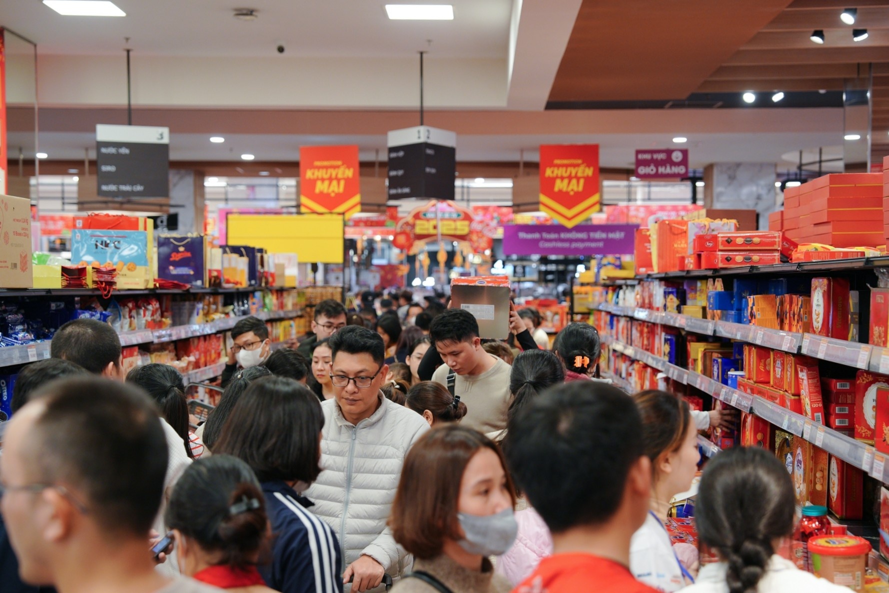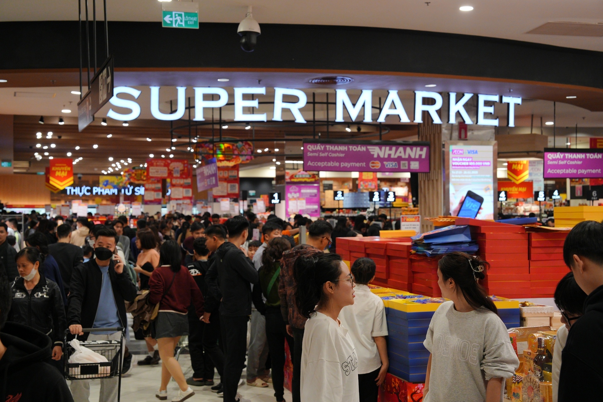 Lối đi giữa các gian hàng trong trung tâm thương mại luôn chật kín người, xe đẩy nối đuôi nhau. Lượng khách những ngày gần đây tăng mạnh so với cùng kỳ năm ngoái và dự kiến sẽ tiếp tục gia tăng trong những ngày cận Tết