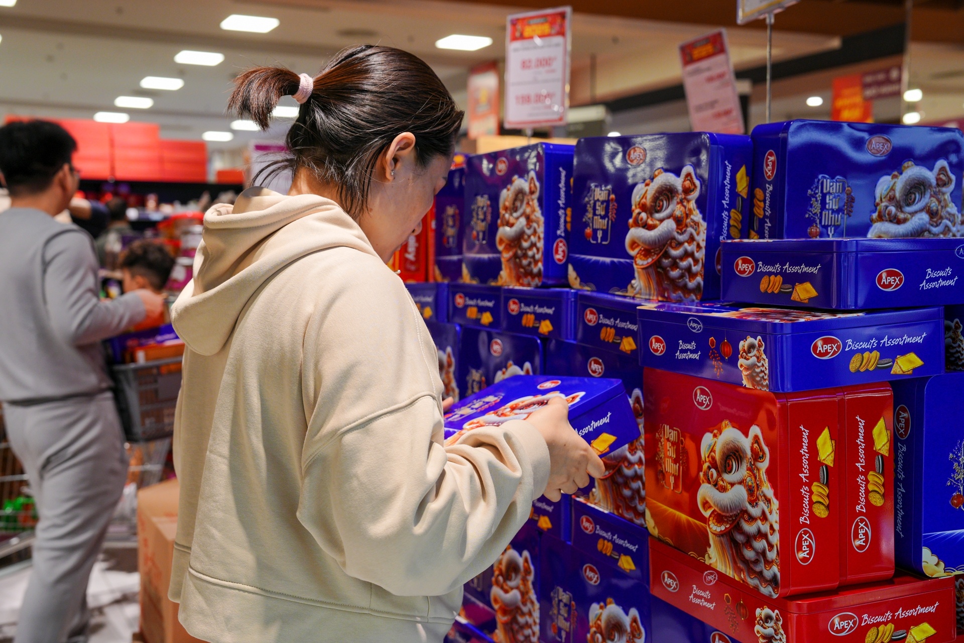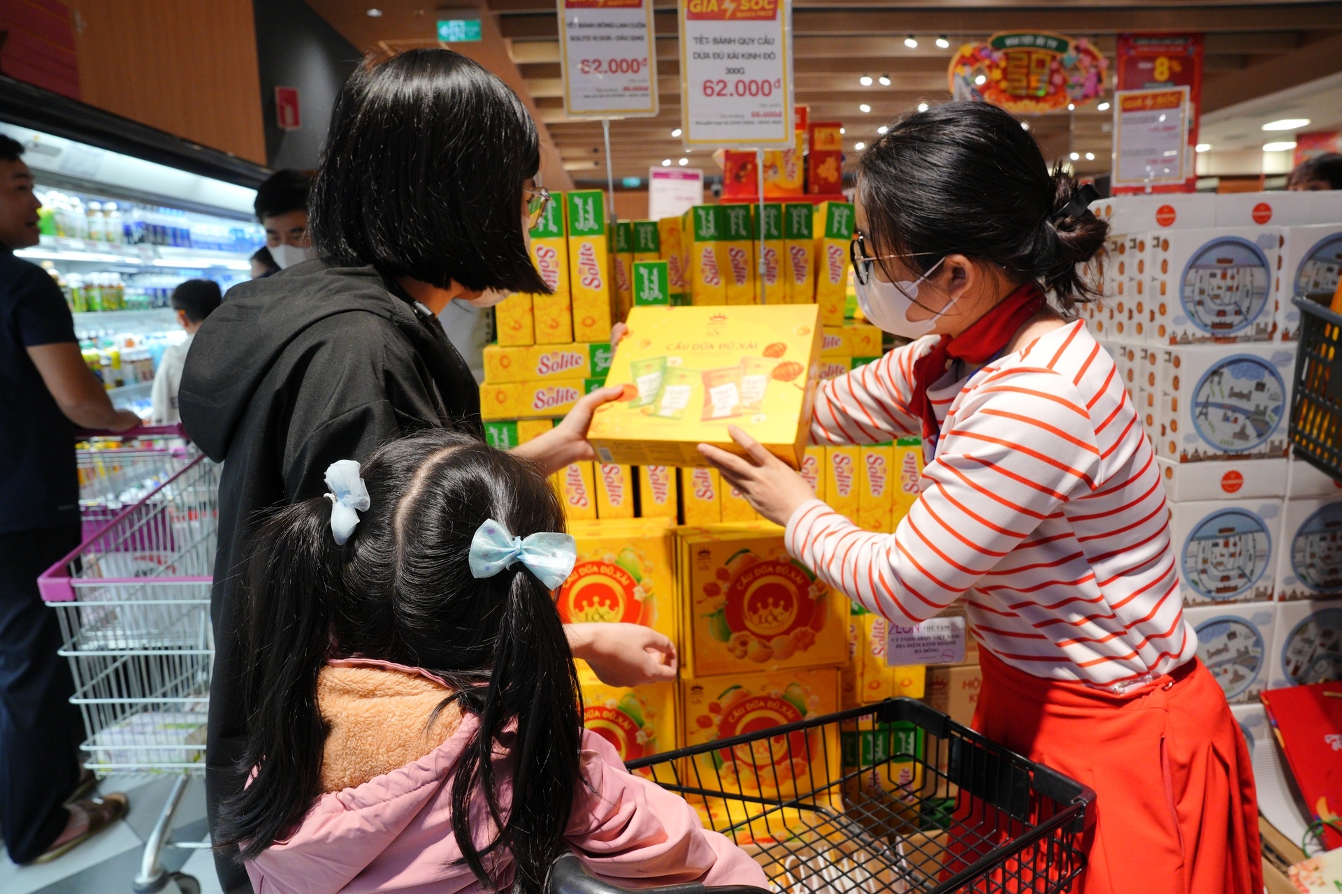 Chị Thùy Dương (Hà Đông) chọn những hộp bánh mua về để chưng Tết và biếu người thân. "Sắp Tết, nhu cầu mua sắm tăng cao, chủ yếu là bánh kẹo và thực phẩm. Tôi tranh thủ mua sớm để có thêm thời gian dọn dẹp nhà cửa", chị chia sẻ.