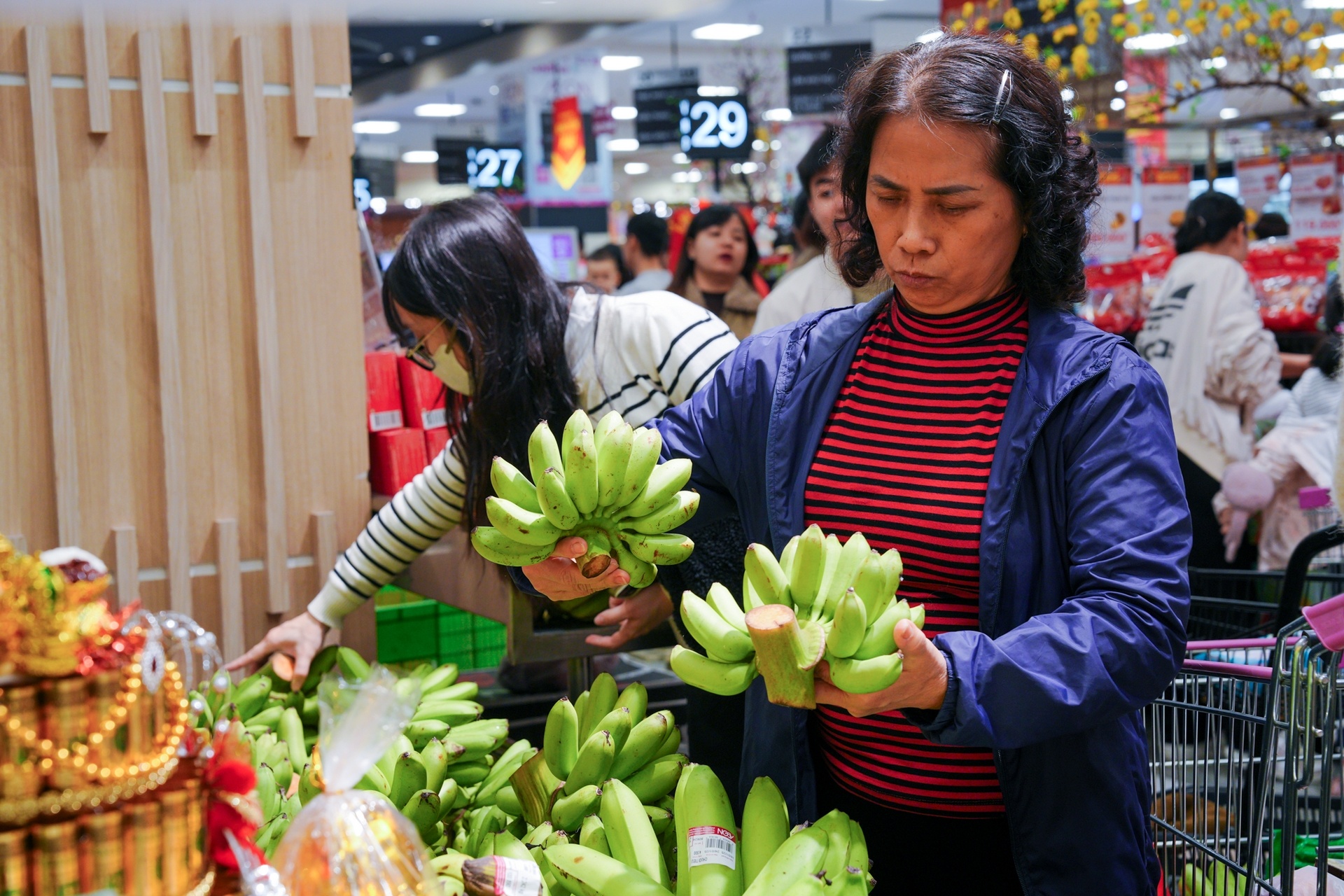 Nhiều loại trái cây chưng Tết như chuối, bưởi... có mẫu mã đẹp, đồng đều. "Tuy giá có nhỉnh hơn so với ngoài chợ nhưng các mặt hàng này có chất lượng đảm bảo, ngoại hình đẹp, thích hợp để trưng trên bàn thờ", bà Kim Anh, 55 tuổi cho biết.