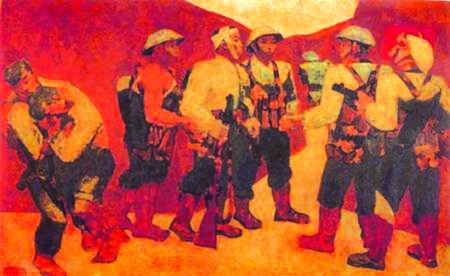 Điểm nhấn của bức tranh là 3 chiến sĩ, trong đó có một chiến sĩ trên đầu còn quấn băng với khẩu súng trong tay. Chủ đề càng trở nên chặt chẽ khi bố cục được liên kết với hai chiến sĩ phía bên phải bức tranh bằng một cái bắt tay tình nghĩa và cũng đầy quyết tâm. Góc trái bức tranh là hình ảnh một chiến sĩ đang dìu một đồng đội bị thương. Phía xa là một chiến sĩ như đang tiếp tục cuộc hành quân ra trận.
