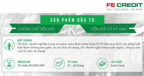 FE CREDIT hiện có hai dòng sản phẩm huy động vốn được định hình và hoàn thiện cả về quy mô lẫn chất lượng để phù hợp với nhu cầu của các nhà đầu tư bao gồm: Chứng chỉ tiền gửi (CCTG) và tiền gửi có kỳ hạn (TGCKH). Với giá trị đầu tư tối thiểu 50 triệu đồng, kỳ hạn linh hoạt từ 1 đến 60 tháng, CCTG và TGCKH là các sản phẩm hướng đến những khách hàng có nhu cầu đầu tư ngắn hạn với mức vốn vừa phải.