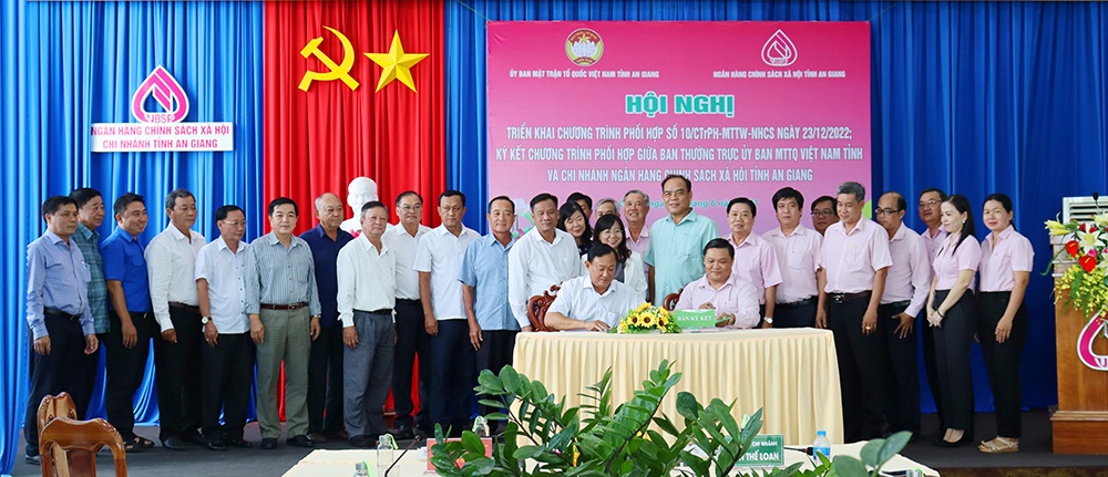 | Đại diện Ban Thường trực Ủy ban MTTQ Việt Nam tỉnh An Giang và Ngân hàng Chính sách xã hội chi nhánh tỉnh An Giang ký kết chương trình phối hợp. |