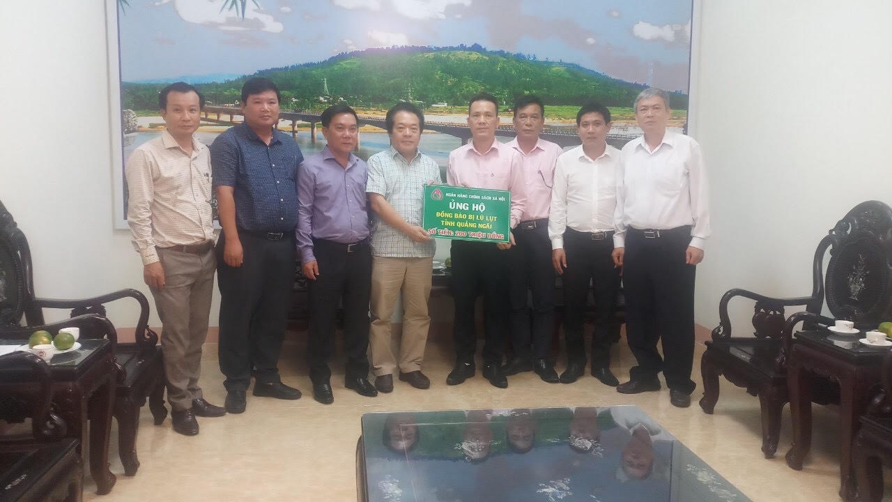 Trước đó, cũng trong đợt mưa lũ vừa qua, NHCSXH cũng kịp thời chia sẻ, thăm hỏi, động viên và trao ủng hộ cho gia đình ông Phạm Văn Neo bị chết đuối do nước lũ cuốn trôi tại thôn Nước Lầy, xã Ba Ngạc, huyện Ba Tơ, tỉnh Quảng Ngãi. Tổng số tiền trao tặng ủng hộ bị lũ lụt tại tỉnh Quảng Ngãi là 215 triệu đồng.