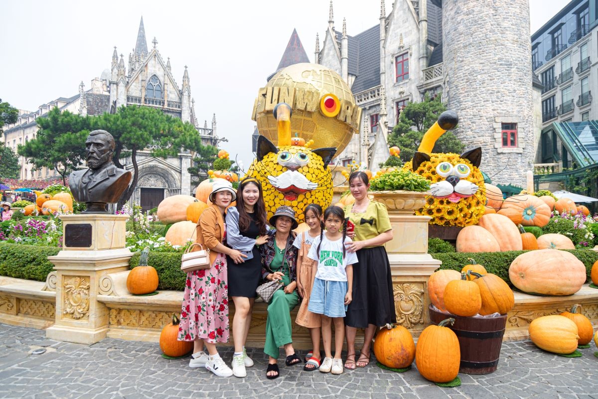 Đến với Sun World Ba Na Hills trong dịp này, du khách hẳn sẽ rất ấn tượng với khung cảnh mùa thu vàng châu Âu thơ mộng, lãng mạn được tái hiện tại khu du lịch. Những tiểu cảnh, mâm cỗ khổng lồ được kiến tạo từ những quả bí ngô đủ màu sắc và hình dáng, được đặt tại khu vực Đài phun nước và Quảng trường Hội tụ, hứa hẹn sẽ kiến tạo nên các điểm check-in có 1-0-2 và những bức hình đẹp chất lừ cho du khách.