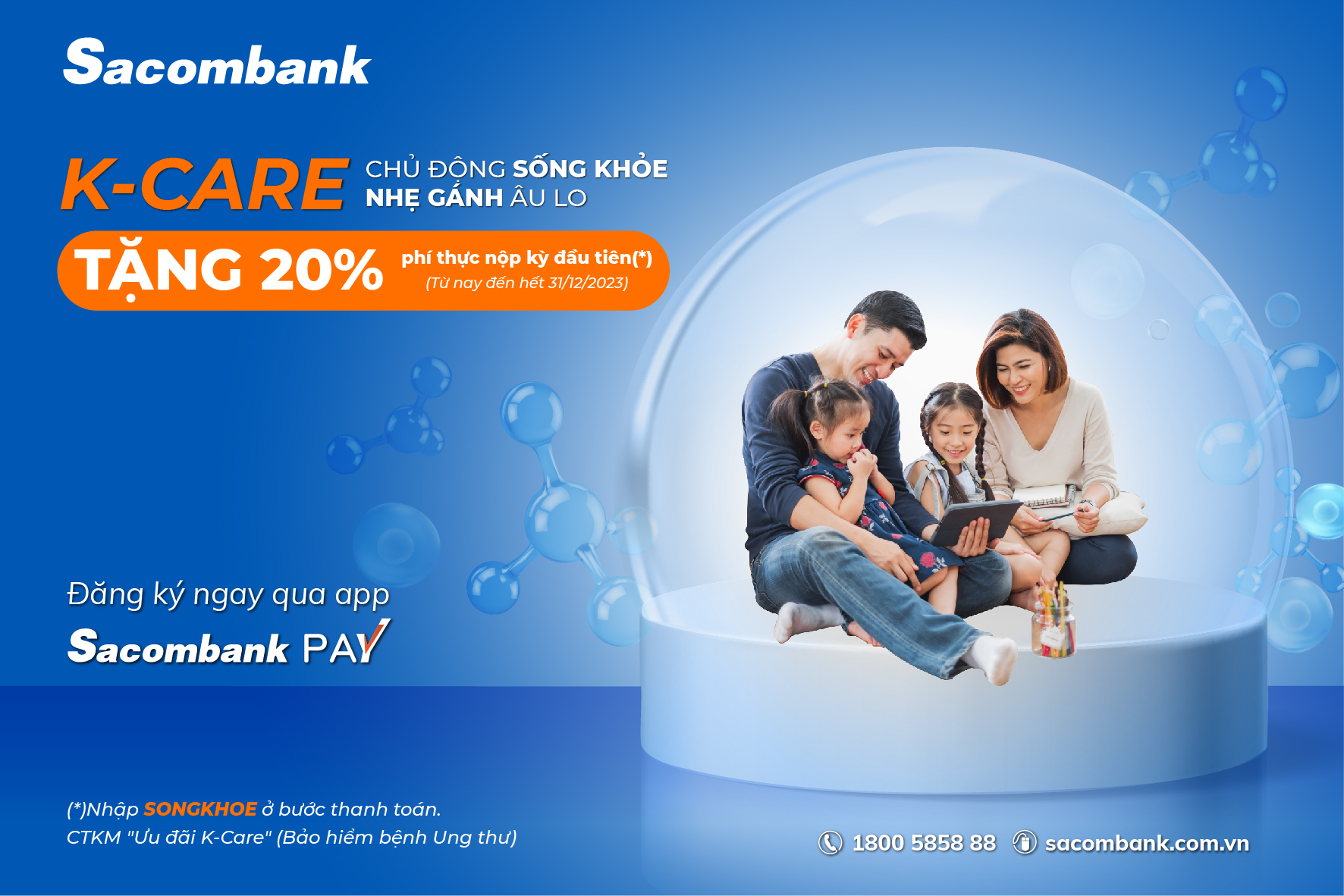 Đối với khách hàng tham gia mới Hợp đồng bảo hiểm bệnh ung thư (K-Care) trên ứng dụng Sacombank Pay sẽ được tặng ngay 20% phí thực nộp kỳ đầu từ chương trình “Ưu đãi K-Care” khi nhập mã SONGKHOE. Chương trình không giới hạn số lượng hợp đồng và mã ưu đãi. K-Care là sản phẩm được Sacombank và Dai-ichi Life Việt Nam phân phối trực tuyến từ tháng 10/2021 dành cho khách hàng từ 18 đến 60 tuổi với quyền lợi vượt trội trong và sau điều trị ung thư cùng mức bảo vệ lên đến 500 triệu đồng.