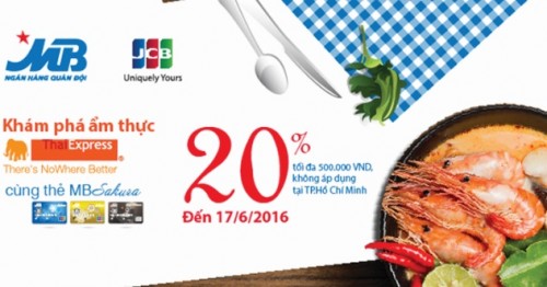Từ nay đến hết 17/6/2016, khi thanh toán bằng thẻ tín dụng quốc tế MB Sakura tại hệ thống nhà hàng ThaiExpress, chủ thẻ MB Sakura sẽ được giảm ngay 20% trên hóa đơn thanh toán (tối đa 500.000 VNĐ).