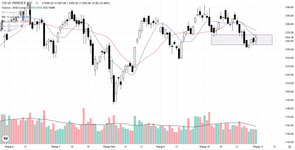 Về kỹ thuật, VN-Index tăng điểm với volume thấp và đóng cửa dưới kháng cự 1.265 điểm cho thấy bên mua chưa sẵn sàng tăng cường độ để vượt qua vùng điểm số này. Áp lực bán vào cuối phiên có thể duy trì cho tới phiên sau khiến vùng 1.255-1.265 điểm tiếp tục là vùng dao động của chỉ số. Xu hướng chính chưa thay đổi. Nhà đầu tư được khuyến nghị giữ tỷ trọng cổ phiếu ở mức thấp.