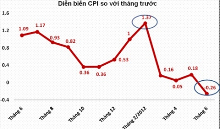 Nếu nhìn lại diễn biến CPI trong 6 tháng đầu năm, về cơ bản là xu hướng giảm nhiệt rất nhanh đang hiển hiện. Biểu đồ diễn biến CPI so với tháng trước cho thấy một sự xáo trộn nhỏ ở giai đoạn Tết Nguyên đán, nhưng sau đó, chỉ số giá tiêu dùng đã có nhiều tháng tăng ở mức rất thấp, trước khi giảm vào tháng này.