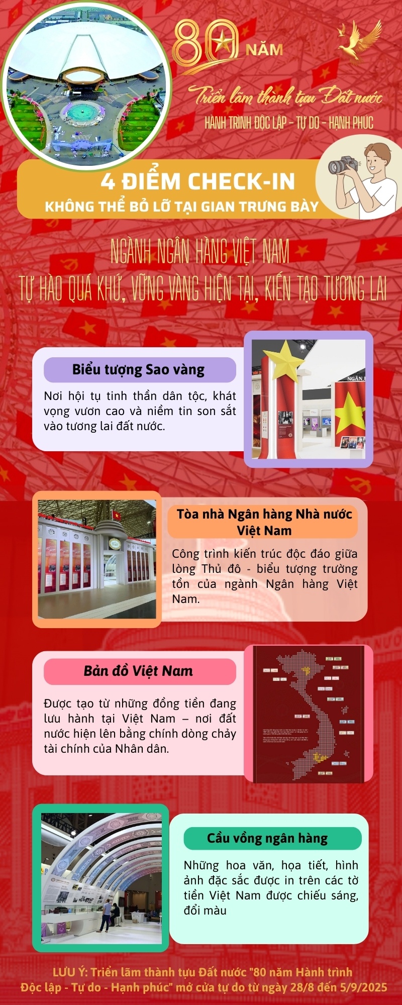 Từ ngày 28/8 đến 5/9, tại sảnh 01 - Trung tâm Hội chợ Triển lãm Quốc gia, ngành Ngân hàng Việt Nam vinh dự góp mặt tại Triển lãm thành tựu Đất nước "80 năm Hành trình Độc lập - Tự do - Hạnh phúc" nhân kỷ niệm 80 năm Quốc khánh (2/9/1945 – 2/9/2025). Với chủ đề "Ngành Ngân hàng Việt Nam - Tự hào quá khứ, vững vàng hiện tại, kiến tạo tương lai", gian trưng bày được thiết kế độc đáo, giàu tính trải nghiệm và những điểm nhấn ấn tượng, tái hiện trọn vẹn hành trình đồng hành cùng dân tộc. Không chỉ là một không gian triển lãm, đây còn là lời khẳng định về vai trò "huyết mạch" của nền kinh tế, đã và đang đóng góp quan trọng vào công cuộc đổi mới, phát triển đất nước, hướng tới một tương lai thịnh vượng.