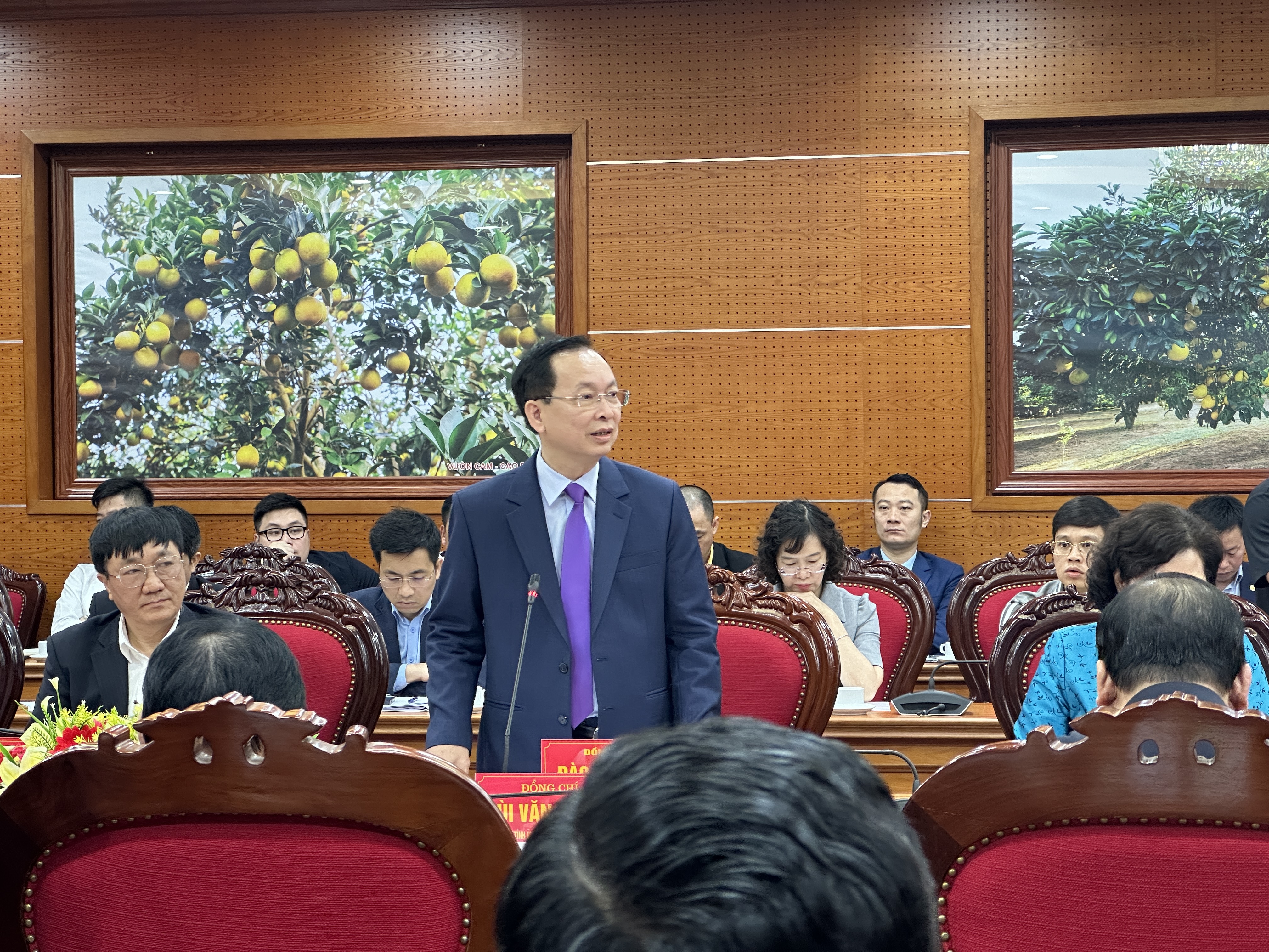 | Đồng chí Nguyễn Phi Long, Ủy viên dự khuyết Ban Chấp hành Trung ương Đảng, Bí thư Tỉnh ủy tỉnh Hòa Bình phát biểu tại buổi làm việc |