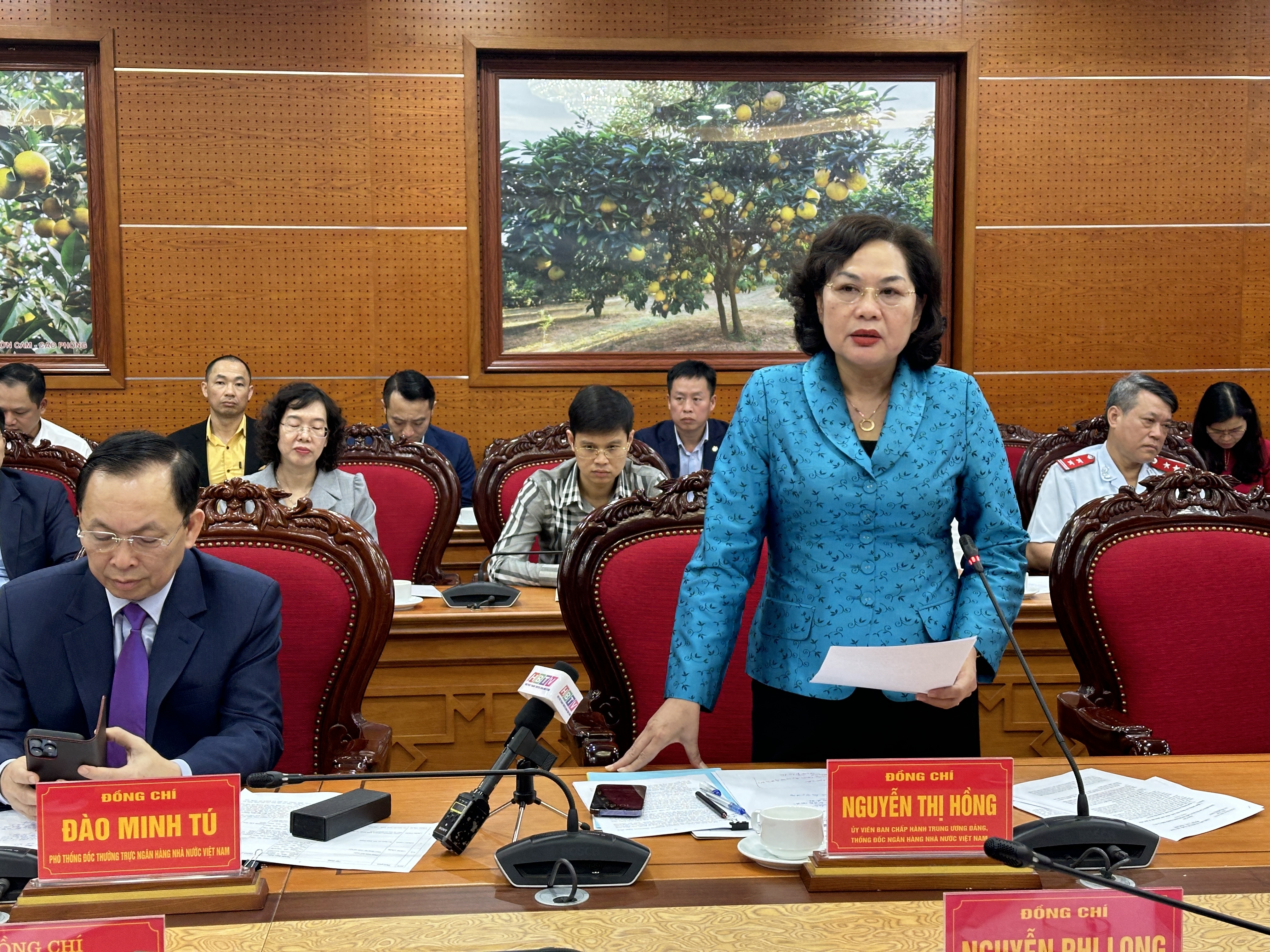 | Đồng chí Nguyễn Thị Hồng, Ủy viên Ban Chấp hành Trung ương Đảng, Bí thư Ban cán sự Đảng, Thống đốc NHNN Việt Nam phát biểu tại buổi làm việc |