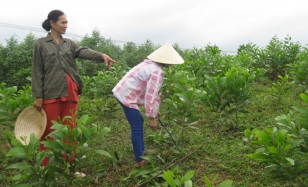 Chị Hồng - Tổ trưởng Tổ tiết kiệm và vay vốn thôn 3 kiểm tra vườn giống keo tai tượng của các gia đình tổ viên