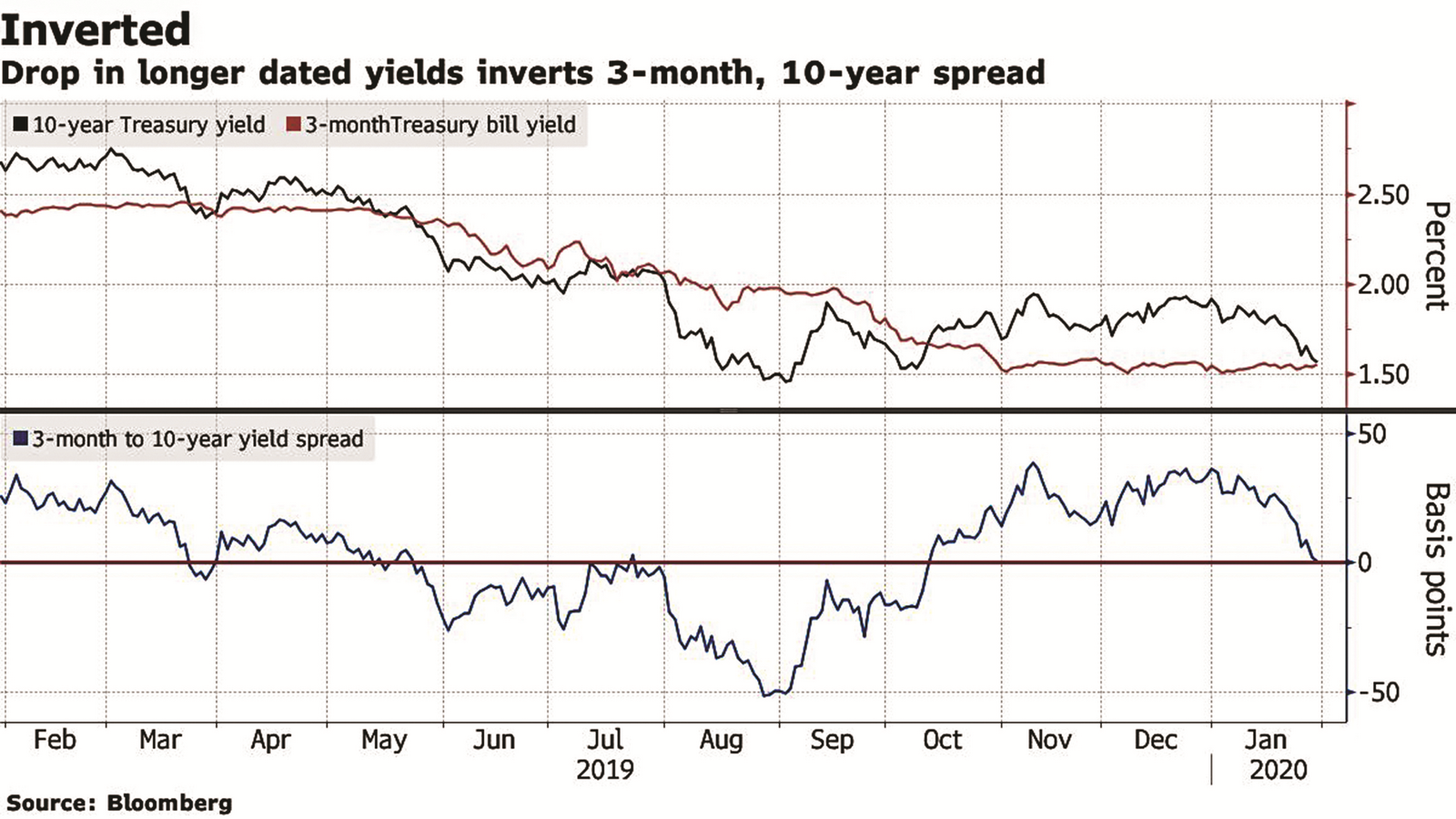 Trong phiên giao dịch thứ Năm tuần trước, có thời điểm lợi suất trái phiếu Kho bạc Mỹ kỳ hạn 10 năm giảm xuống còn 1,53%, mức thấp nhất kể từ tháng 10 năm ngoái; qua đó đưa chênh lệch lợi suất giữa trái phiếu 3 tháng và 10 năm đã giảm xuống mức thấp nhất là âm 2 điểm cơ bản.