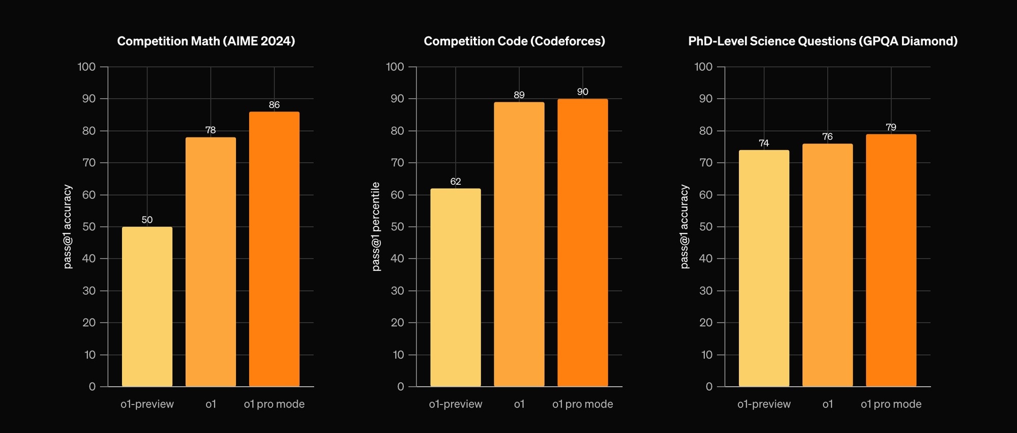Gói ChatGPT Pro cũng bao gồm quyền truy cập vào GPT-4o, chế độ Giọng nói Nâng cao và đặc biệt là chế độ o1 Pro, được thiết kế để tận dụng tối đa sức mạnh tính toán, đưa ra câu trả lời chính xác nhất cho những câu hỏi hóc búa nhất. Theo OpenAI, o1 Pro vượt trội hơn cả o1 và o1-preview trong các bài kiểm tra tiêu chuẩn về học máy, đặc biệt là trong lĩnh vực khoa học dữ liệu, lập trình và phân tích án lệ, với tỷ lệ giảm lỗi lên đến 75% trong các câu hỏi lập trình thông thường.