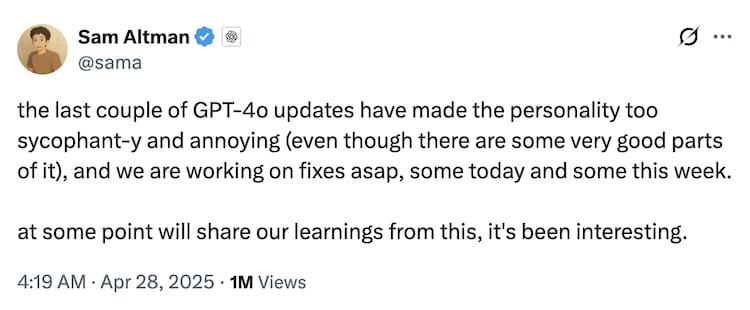 Trong một bài đăng chính thức trên blog, OpenAI thừa nhận sai sót khi “quá tập trung vào phản hồi ngắn hạn mà không lường trước được cách người dùng tương tác với ChatGPT sẽ thay đổi theo thời gian”. Điều này dẫn đến những phản hồi bị đánh giá là “quá mức ủng hộ nhưng thiếu chân thành”.