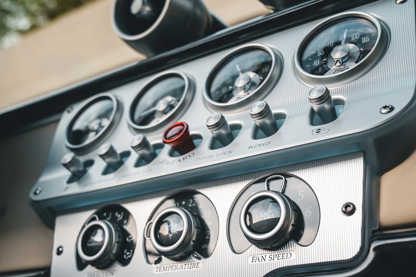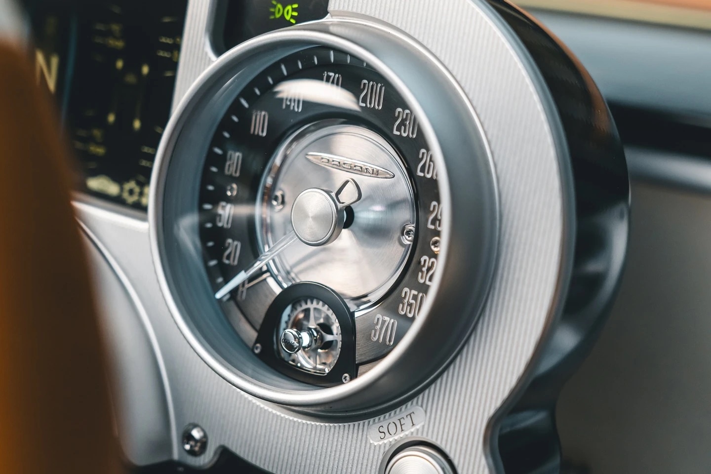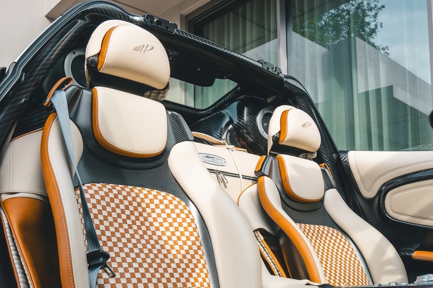 Khoang lái của Utopia Roadster sử dụng da Grecale và Huayra Signature, kết hợp hai tông màu kem và nâu hài hòa. Các đường chỉ may caro được thực hiện thủ công, tạo ấn tượng mạnh mẽ. Khoang lái nổi bật với loạt phím bấm cơ, bảng đồng hồ mạ chrome và kim loại điện phân, không có màn hình trung tâm, mang lại cảm giác vừa cổ điển nhưng vẫn hiện đại.