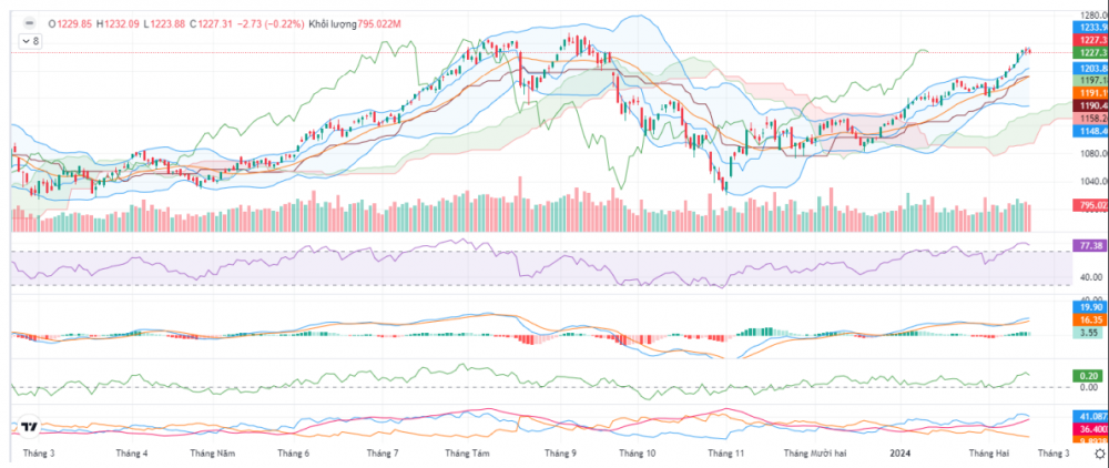 Ở khung đồ thị giờ, VN-Index vẫn bám sát đường Tenkan của mây Ichimoku và dải Bollinger band có xu hướng bó vào cho thấy thị trường đang trong nhịp rung lắc tích lũy trong biên độ hẹp 10 điểm trước khi tăng điểm trở lại.