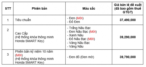 Honda LEAD 125cc phiên bản kỷ niệm 10 năm cùng những sắc màu mới trên phiên bản Tiêu chuẩn và Cao cấp sẽ được chính thức giới thiệu ra thị trường vào ngày 25/06/2018 thông qua Hệ thống Cửa hàng Bán xe và Dịch vụ do Honda Ủy nhiệm (HEAD) trên toàn quốc với chế độ bảo hành 3 năm hoặc 30.000 km (tùy theo điều kiện nào đến trước) và mức giá bán lẻ đề xuất hấp dẫn như sau: